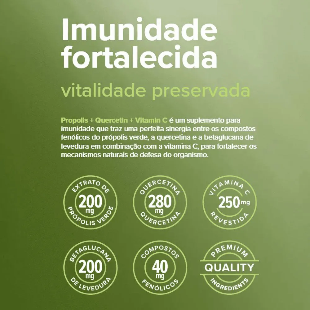 Suplemento formulado para reforçar a imunidade. Combina extrato de própolis verde, quercetina, betaglucana de levedura e vitamina c em sinergia, fortalecendo os mecanismos naturais de defesa do organismo e promovendo mais vitalidade. Diferenciais da fórmula