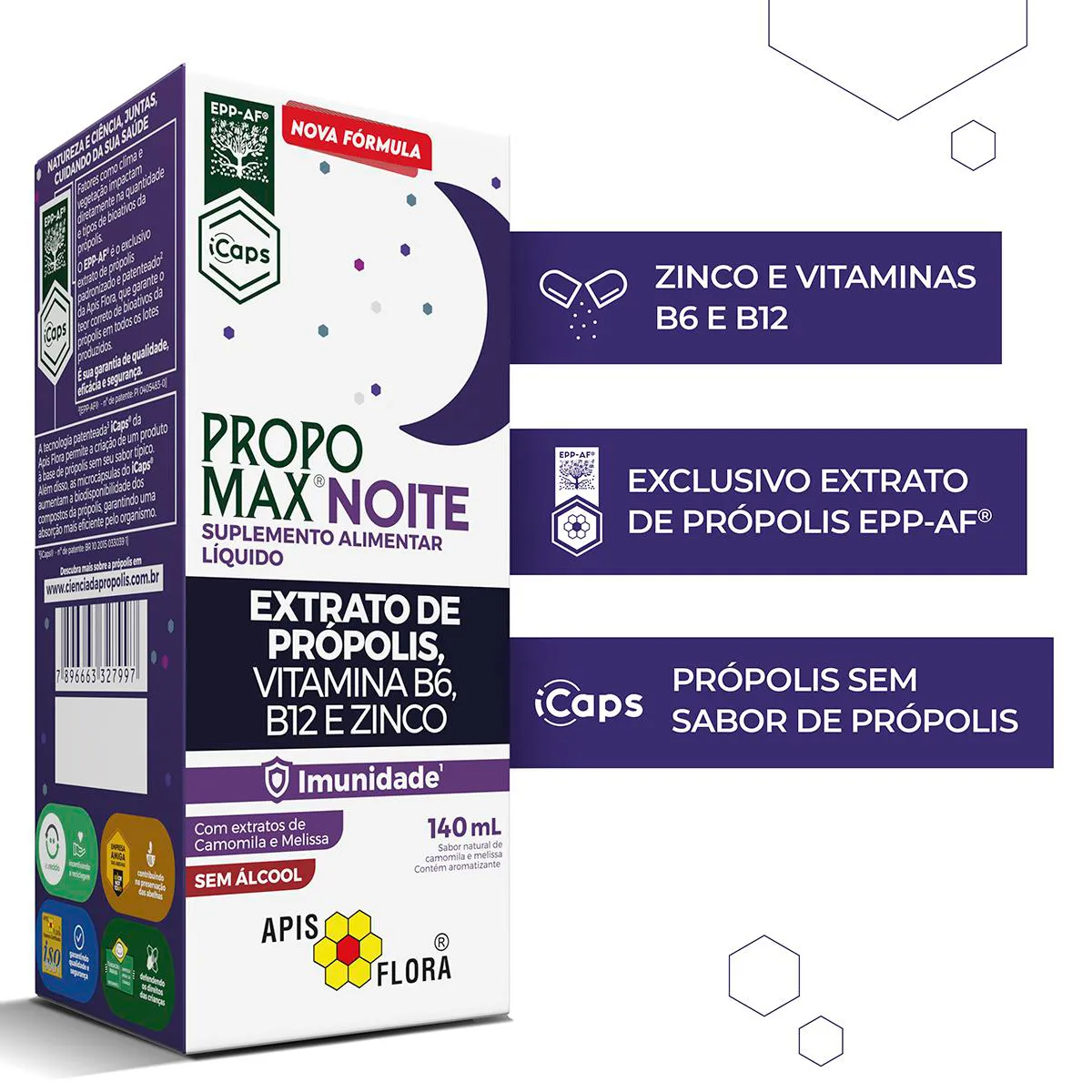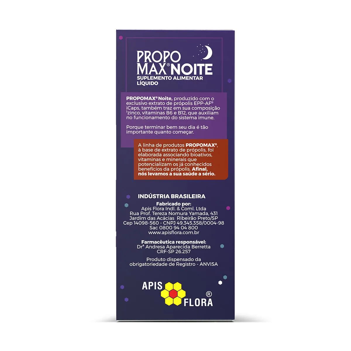 Propomax Noite é um suplemento alimentar líquido feito com Extrato de Própolis com padronização EPP-AF®, desenvolvido especialmente para fortalecer o sistema imunológico.