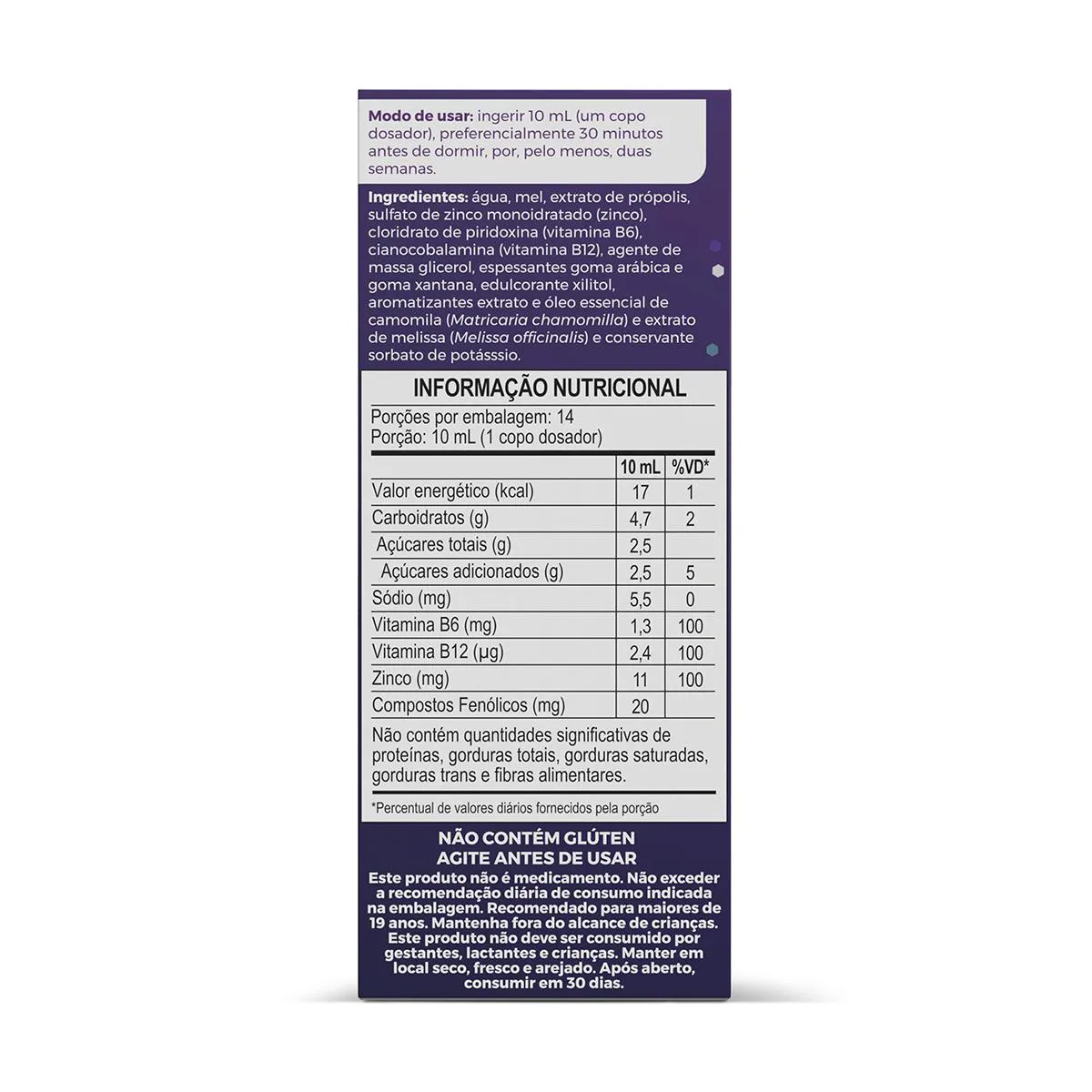 Sua fórmula também conta com Extratos de Camomila e Melissa, que ajudam numa melhor noite de sono, e, ainda, é fonte de Zinco, Vitaminas B6 e B12.