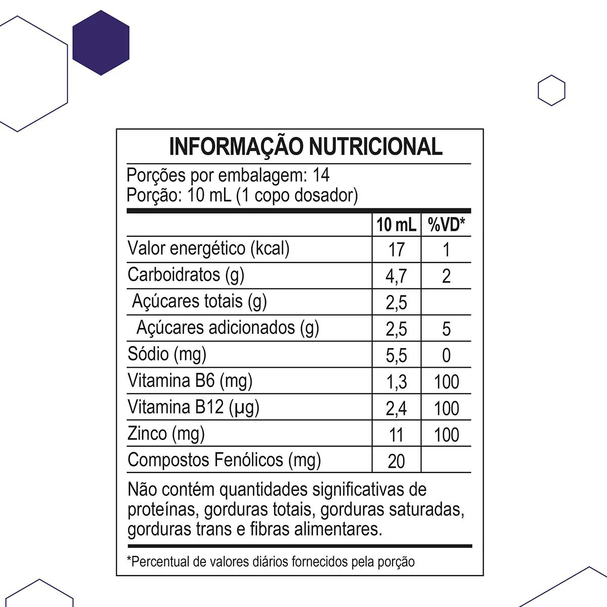 Não contém quantidades significativas de carboidratos, proteínas, gorduras totais, gorduras saturas, gorduras trans e sódio. |