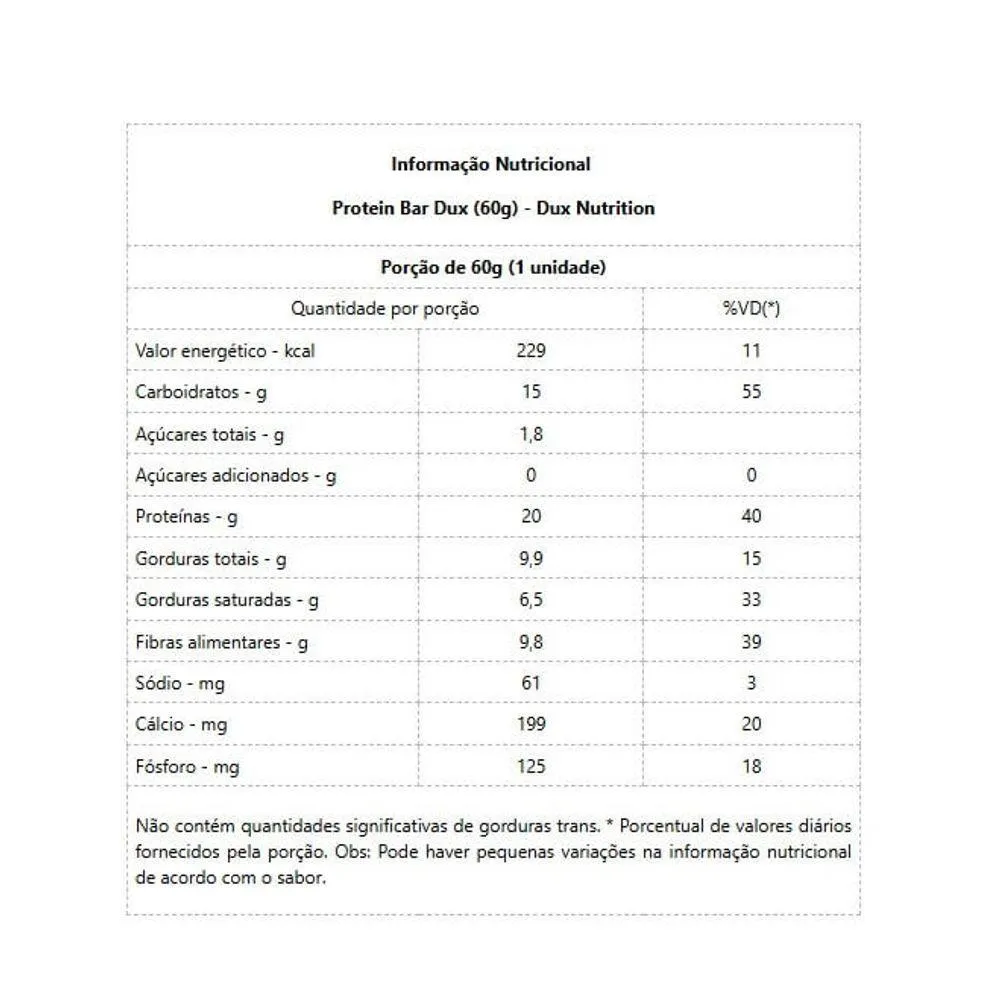 Protein Bar Dux (60g) Protein Bar Dux é ideal para quem busca uma maneira prática e saborosa de complementar a ingestão diária de proteínas. Cada barra contém 20g de proteína, ajudando no ganho de massa muscular, controle do apetite e promoção de saciedade. Enriquecida com frutas naturais para maior valor nutritivo e sabor, é perfeita como lanche intermediário, apoio na recuperação pós-treino ou para manter um estilo de vida saudável. Com Protein Bar Dux, você alcança suas metas proteicas diárias enquanto desfruta de um lanche delicioso e nutritivo. As barras proteicas são ótimas opções para lanches entre as refeições principais, já que são fontes de proteínas de alto valor biológico, com quantidades equilibradas de carboidratos e gorduras. Ideal para todos que buscam um estilo de vida saudável. Benefícios: - 20g de Proteínas;- Corantes e Aromas Naturais;- Sem Açúcares Adicionados;- Praticidade e Sabor.