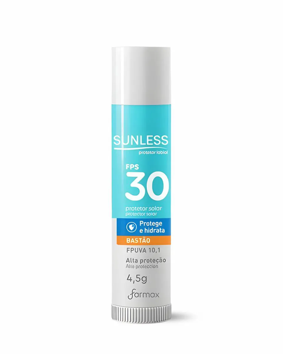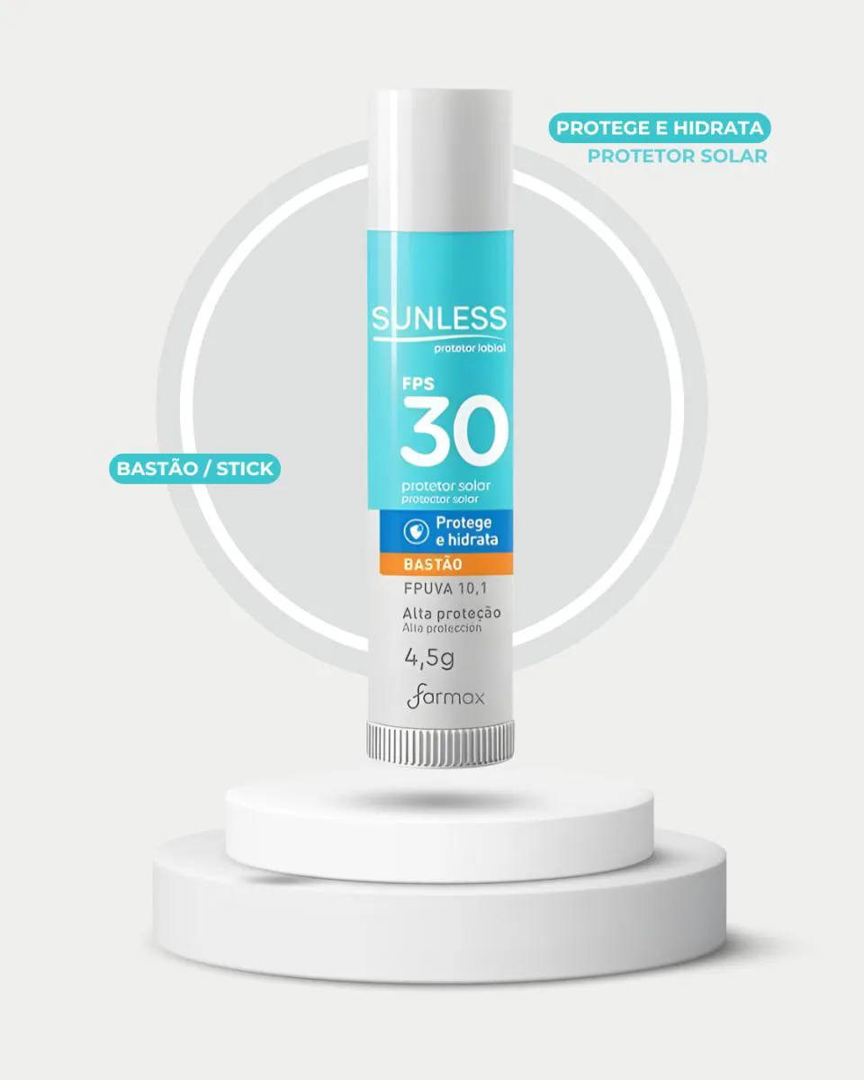 O protetor labial bastão FPS 30 da Farmax (linha Sunless) serve para proteger os lábios contra os raios solares UVA e UVB, prevenindo queimaduras solares, ressecamento, rachaduras e descamação, enquanto também hidrata profundamente, deixando-os macios, sedosos e com aparência saudável, sendo ideal para uso diário e durante a exposição ao sol, vento e frio, com fórmulas que podem incluir vitamina e e Óleo de Rícino para um cuidado extra. Principais Funções: -Proteção Solar: O FPS 30 bloqueia cerca de 97% dos raios UVB, protegendo contra queimaduras. -Hidratação: Deixa os lábios hidratados, macios e aveludados, combatendo o ressecamento. -Ação Dupla: Combina proteção solar e hidratação intensa em um só produto. -Prevenção: Ajuda a prevenir o envelhecimento precoce causado pelo sol e mantém os lábios saudáveis. Como Usar: Aplique abundantemente nos lábios antes da exposição ao sol. Reaplique sempre após sudorese intensa, nadar, se secar com toalha, ou durante a exposição prolongada ao sol, vento e frio, para manter a efetividade.