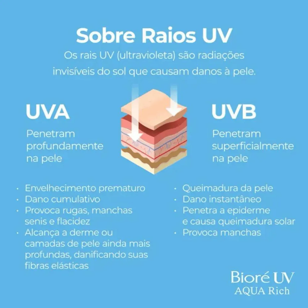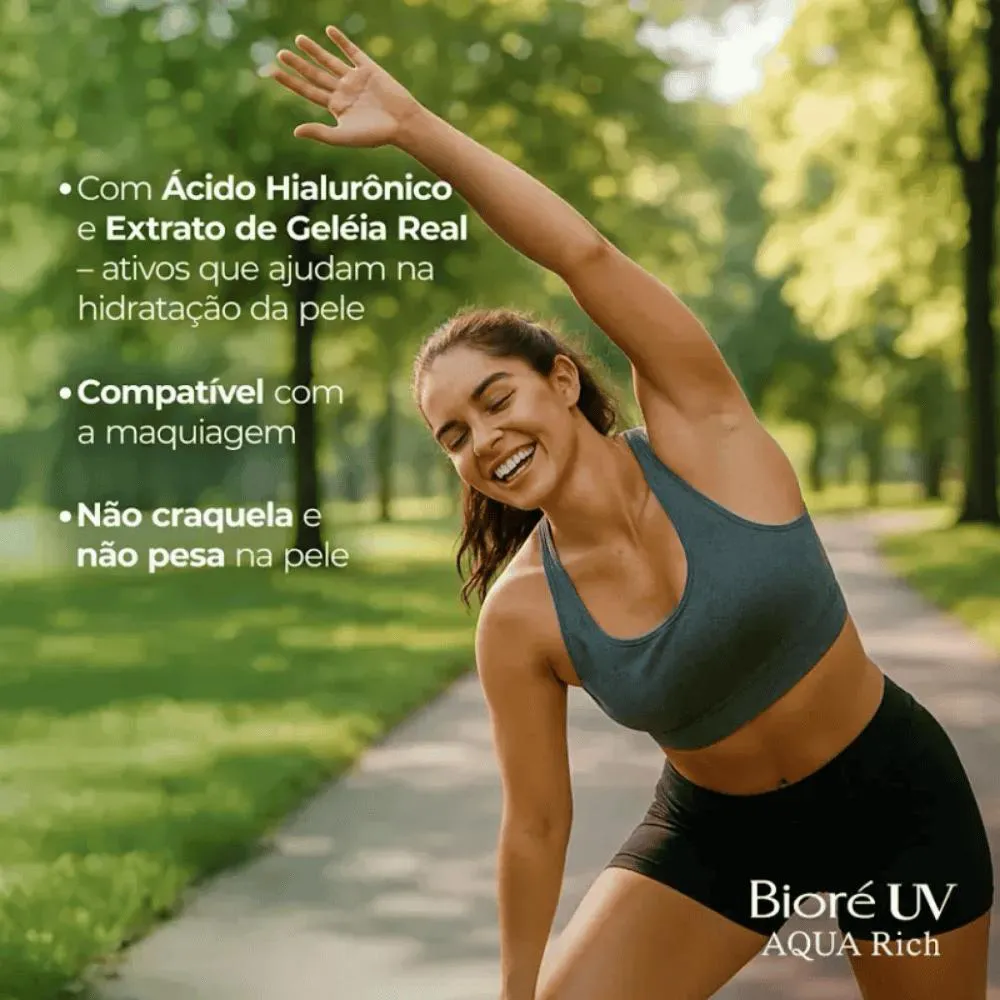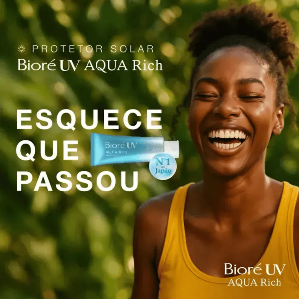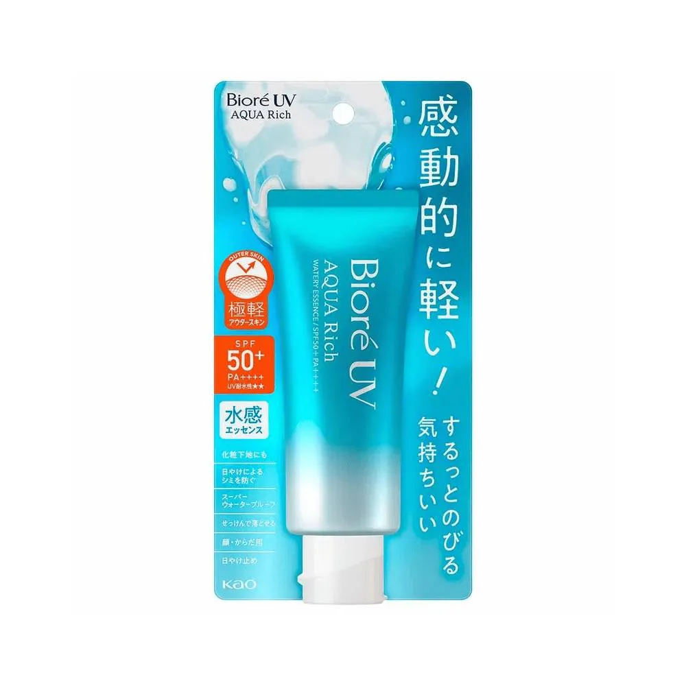 Bioré, a marca Nº 1 em proteção solar no Japão, apresenta Aqua Rich. O protetor solar facial e corporal Aqua Rich Watery Essence com alta proteção UVA e UVB (FPS 50) oferece alta proteção solar de forma leve e fresca, sem pesar. Com sua textura gel aquosa incrivelmente leve e acabamento transparente, não deixa a pele esbranquiçada, oleosa ou pegajosa e é rapidamente absorvido. Graças a sua exclusiva tecnologia MICRO DEFENSE proporciona cobertura uniforme da pele incluindo áreas irregulares. Formulado com ácido hialurônico e extrato de geleia real, ingredientes hidratantes que auxiliam na hidratação da pele. Uma experiência diferente em proteção solar, testada e aprovada no Brasil, por mais de 800 mulheres, com diferentes tipos de pele.