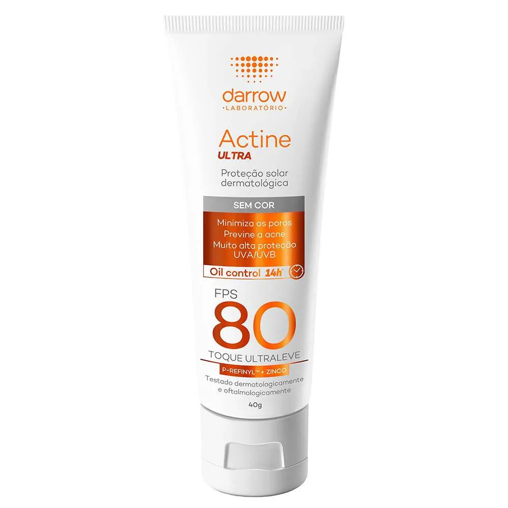 Darrow Actine Ultra protetor solar FPS 80 é uma fórmula especialmente desenvolvida para o cuidado da pele oleosa a acneica. Possui muito alta fotoproteção UVA/UVB, alta eficácia com 14h de ação antioleosidade e textura ultra-fluida de absorção imediata e toque ultraleve. Seu complexo exclusivo de ativos - P-Refynil, Zinco vitamina e e OTZ 10 - garante tripla ação antioleosidade: alta eficácia com 14h de oil control, previne a acne e reduz os poros. Hipoalergênico e testado dermatologicamente. Não arde os olhos. Sem perfume. Produto não testado em animais.