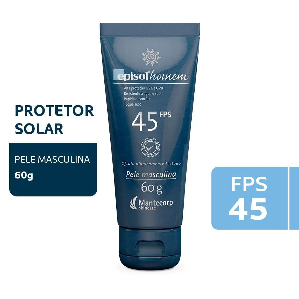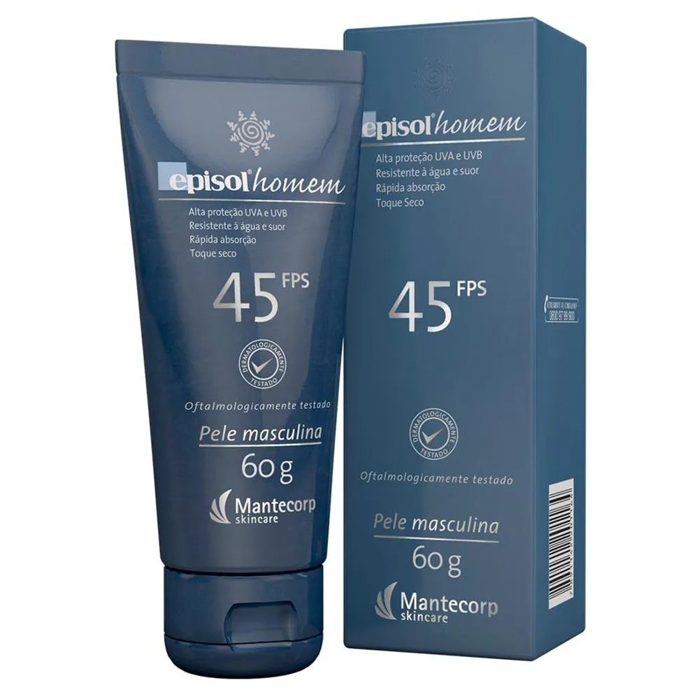 OProtetor Solar Episol Homem FPS 45, possui proteção muito alta contra raios UVA e UVB. Foi desenvolvido especialmente para a pele do homem, pois estudos comprovam que a pele masculina é mais sensível à radiação ultravioleta.