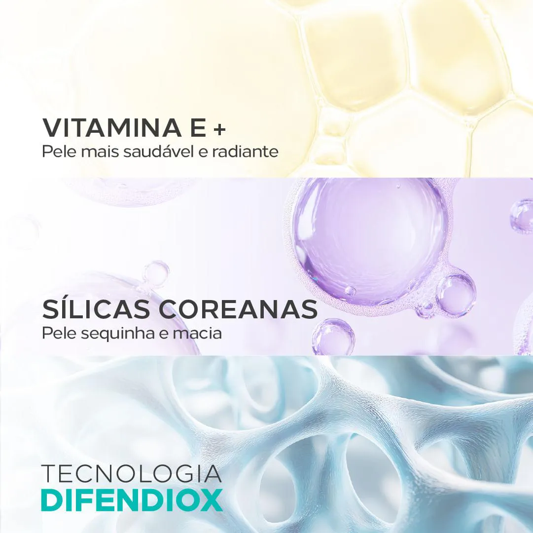 - Sílicas Coreanas: absorvem a oleosidade e proporcionam acabamento seco, confortável e sedoso, com controle inteligente da umidade na pele.