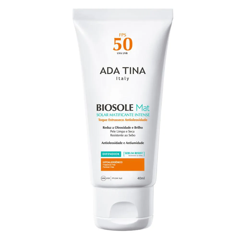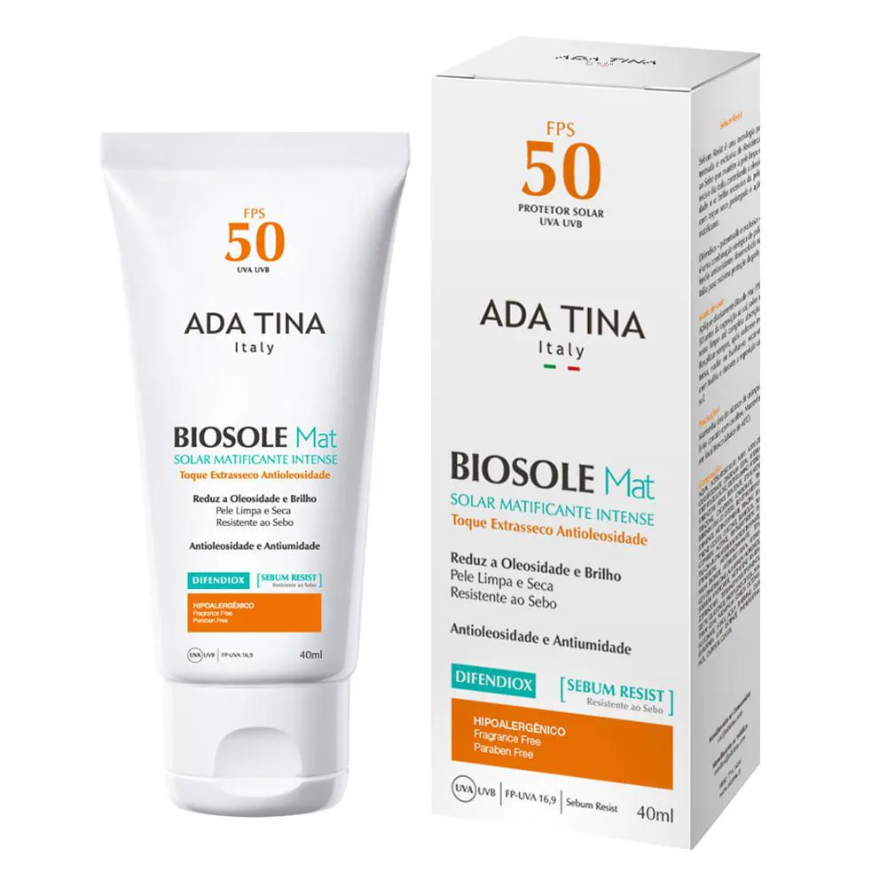 Biosole Mat FPS 50 é um protetor solar multifuncional desenvolvido para pessoas com a pele oleosa ou muito oleosa com ação antioxidante. Graças a combinação de Difendiox e Microssilicas Matificantes, dois poderosos ativos exclusivos, Biosole Mat FPS 50 regula a oleosidade da pele por 12 horas, além de combater os malefícios causados pelos radicais livres, sendo o primeiro protetor solar antioxidante com Proteção 7 in 1 de ADA TINA Italy.