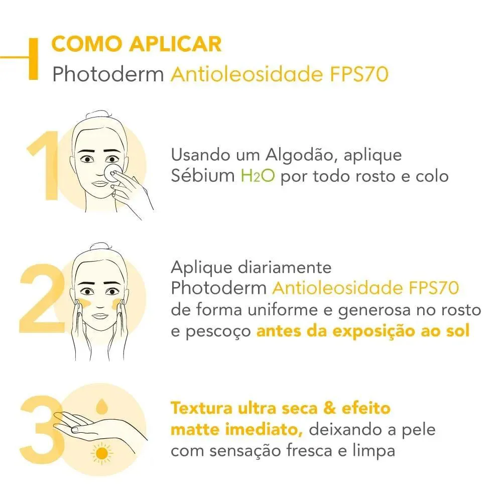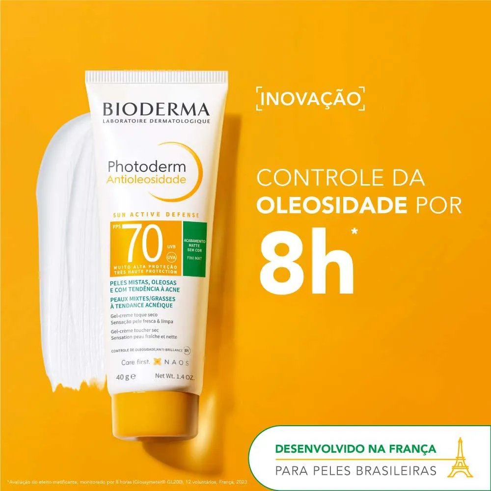 protetor solar Facial Bioderma Photoderm Antioleosidade FPS 70 Alta proteção solar antioleosidade com textura ultra seca e efeito matte imediato desenvolvido na França exclusivamente para a pele brasileira. Peles mistas, oleosas e com tendência a acne, inclusive sensíveis. Resistente à água e suor. Tolerância ocular. Testado sob supervisão dermatológica.