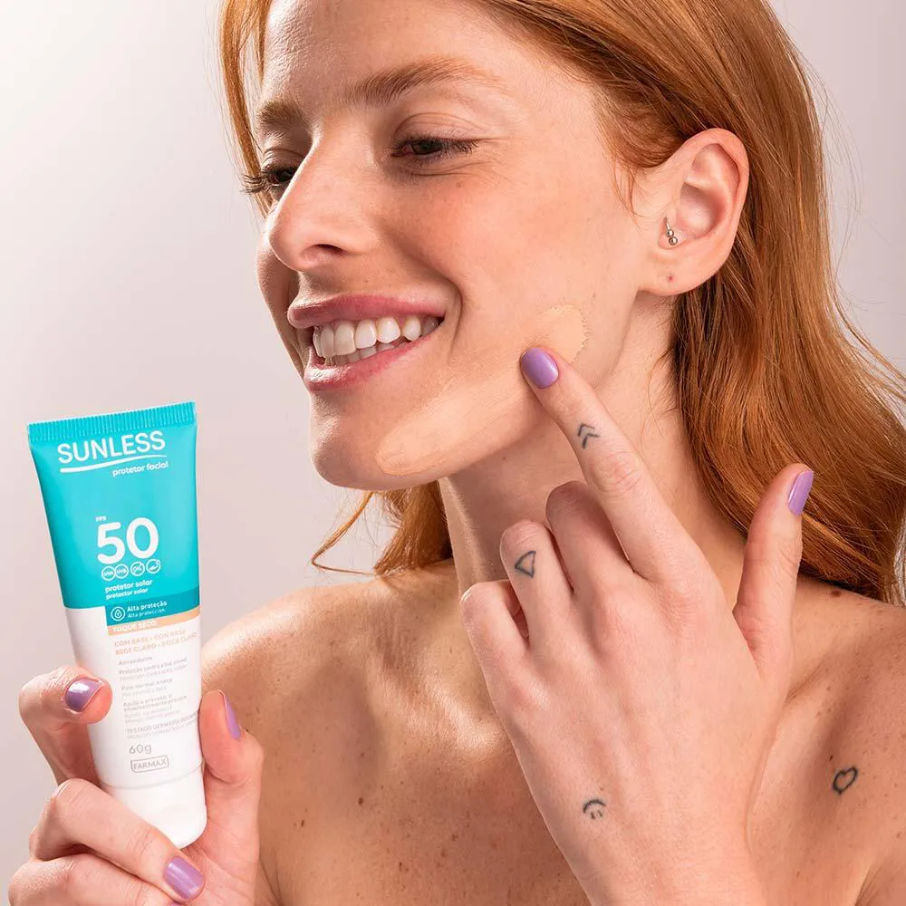 O protetor solar Facial FPS 50 Sunless 60g tem ampla proteção contra a ação dos raios solares UVA e UVB, que provocam diversos danos à pele, como manchas e o envelhecimento precoce.