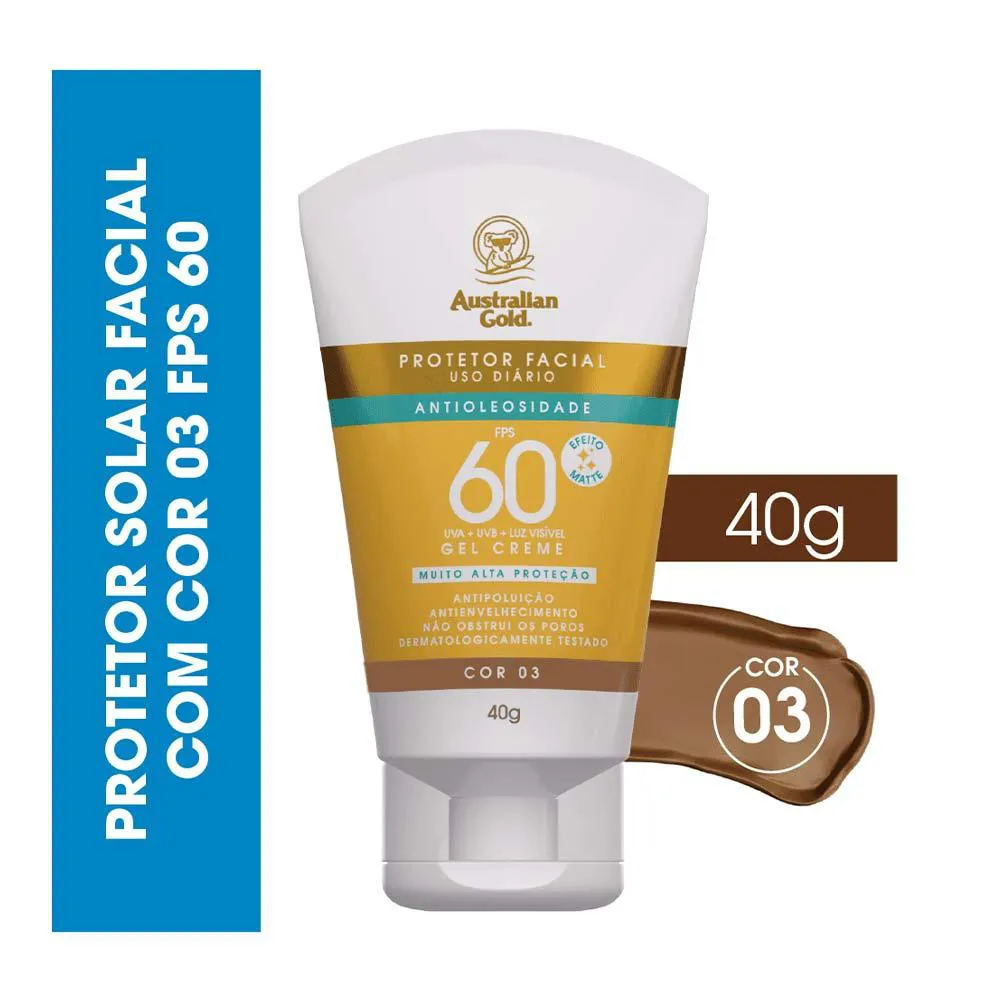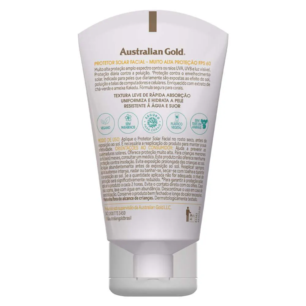protetor solar Facial com FPS 60 que protege contra os raios UVA e UVB e os efeitos diários da poluição. Formulado com ameixa de kakadu e extrato de chá verde, possui ativos antienvelhecimento e ação antioxidante. Com textura ultraleve, toque seco e rápida absorção e efeito matte, a linha Gel Creme de Australian Gold é resistente à água para garantir proteção em todos os momentos.