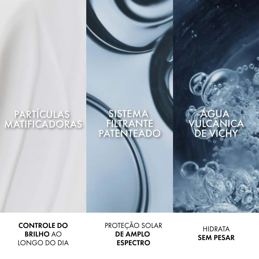 Sua fórmula combina sistema filtrante de amplo espectro com PPD 24 e a Água Vulcânica de Vichy, rica em 15 minerais que fortalecem a barreira cutânea.