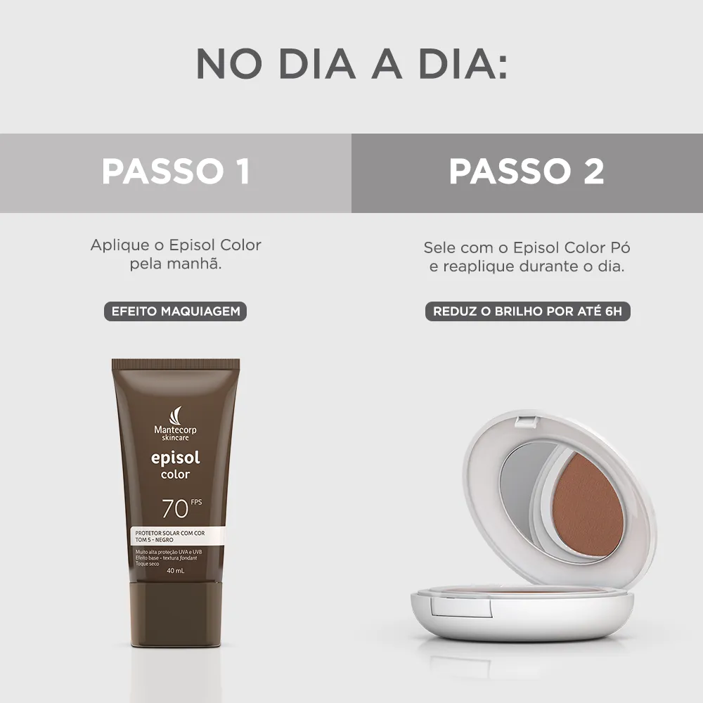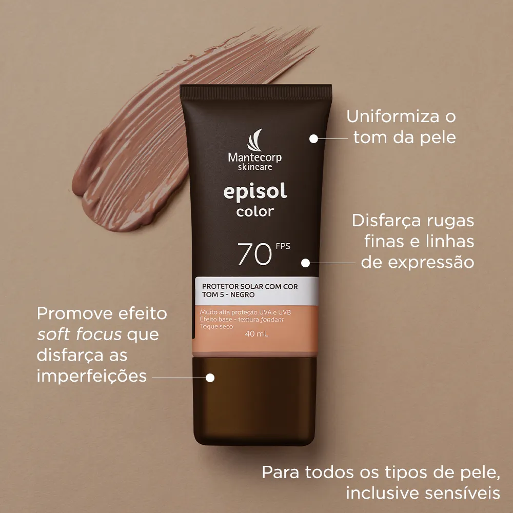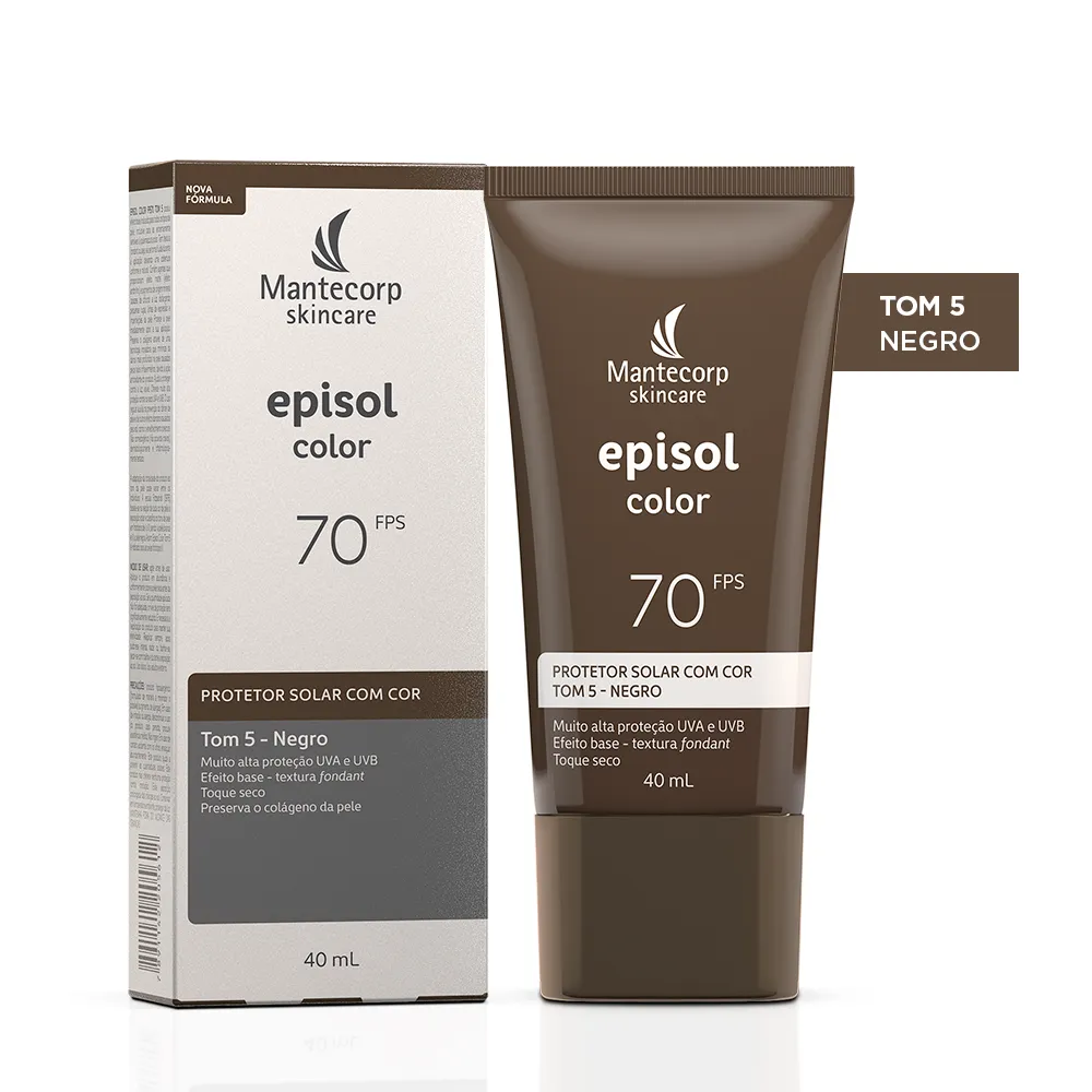 Novo protetor solar Facial Episol Color FPS70: nova fórmula sem cheiro de protetor solar com o mesmo nível de proteção e cobertura, novos nomes, novas embalagens e nova cor!Episol Color é uma linha de fotoprotetores com cor que oferece alta proteção contra os raios UVA/UVB, Luz Visível e Infravermelho A e promove cobertura perfeita e uniforme da pele, com efeito natural, matificante e toque seco. Agora Episol Color FPS70 lança mais uma tonalidade e está com novos, sendo assim a linha de protetores com cor mais diversa do mercado. São 6 cores disponíveis: Tom I - Extraclaro (antigo pele extraclara), Tom II – Claro (antigo pele clara), Tom III – médio (antigo pele morena), Tom IV- médio escuro (antigo pele morena mais), Tom V – negro (antigo pele negra) e o NOVO Tom VI – Negro.