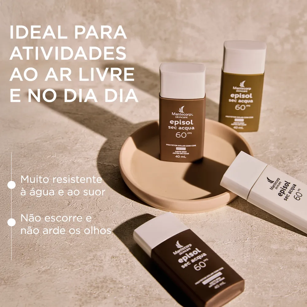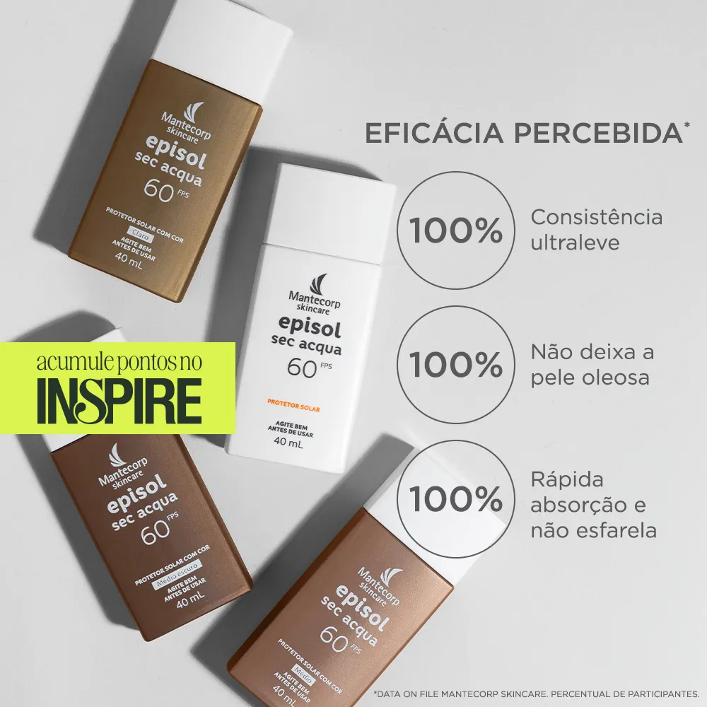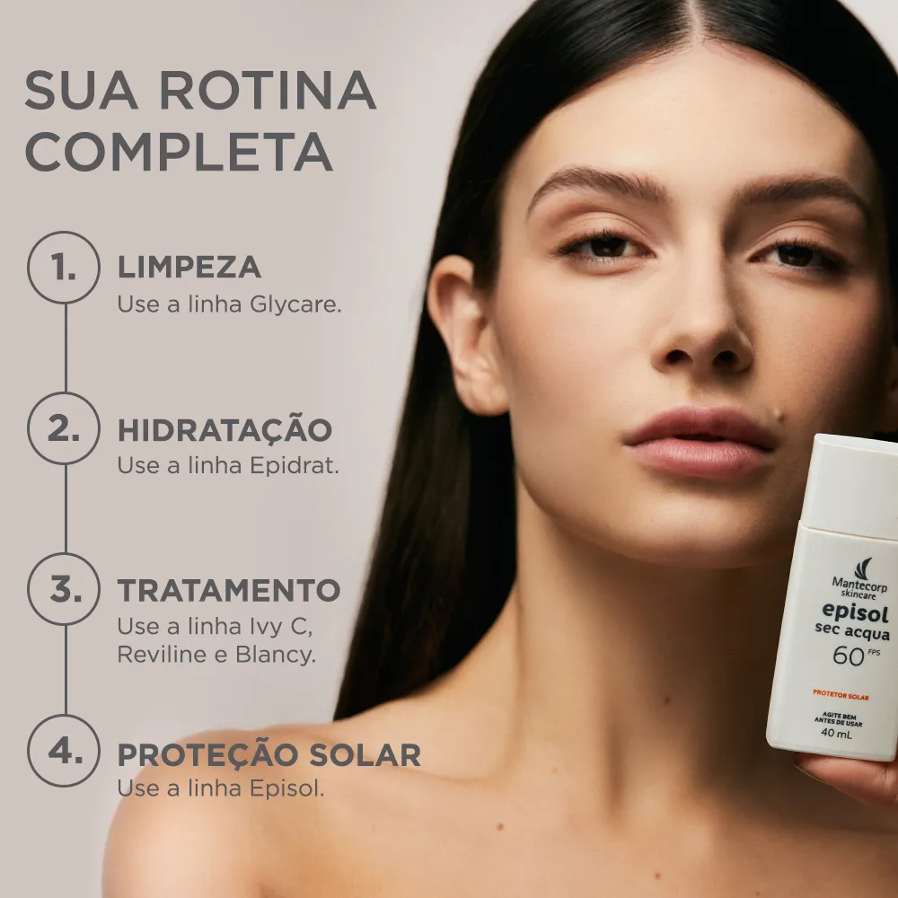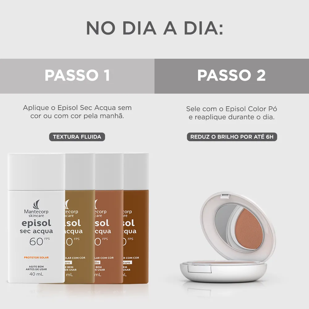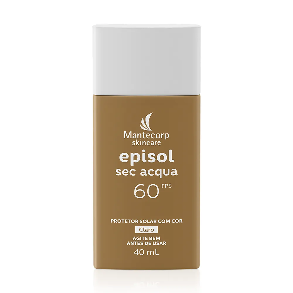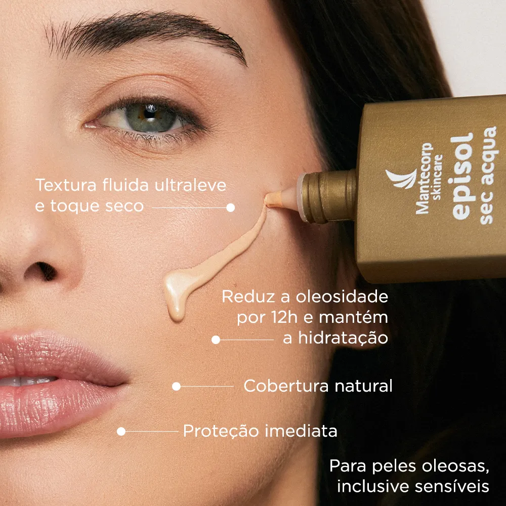 EPISOL SEC ACQUA FPS 60 CLARO possui uma textura ultraleve com base aquosa que oferece rápida absorção e toque seco, ideal para as peles oleosas, inclusive as sensíveis. Seu complexo oil control proporciona efeito matte (efeito antibrilho) e sensação de frescor, além de reduzir a oleosidade da pele por até 12h** e os poros dilatados. Contém ácido hialurônico, centella asiática, responsáveis pela ação hidratante, calmante e rejuvenescedora. A ação antioxidante do produto proporciona efeito antipoluição e preserva o colágeno através de uma tecnologia inovadora que minimiza os danos mais profundos na pele causados pelos raios infravermelhos. Oferece muito alta proteção contra os raios UVA e UVB. Protege a pele imediatamente após a sua aplicação sendo resistente à água e ao suor. O uso regular auxilia na prevenção do câncer de pele e de outros efeitos danosos causados pelo sol, como o envelhecimento precoce. Não comedogênico (não provoca cravos), dermatologicamente e oftalmologicamente testados.