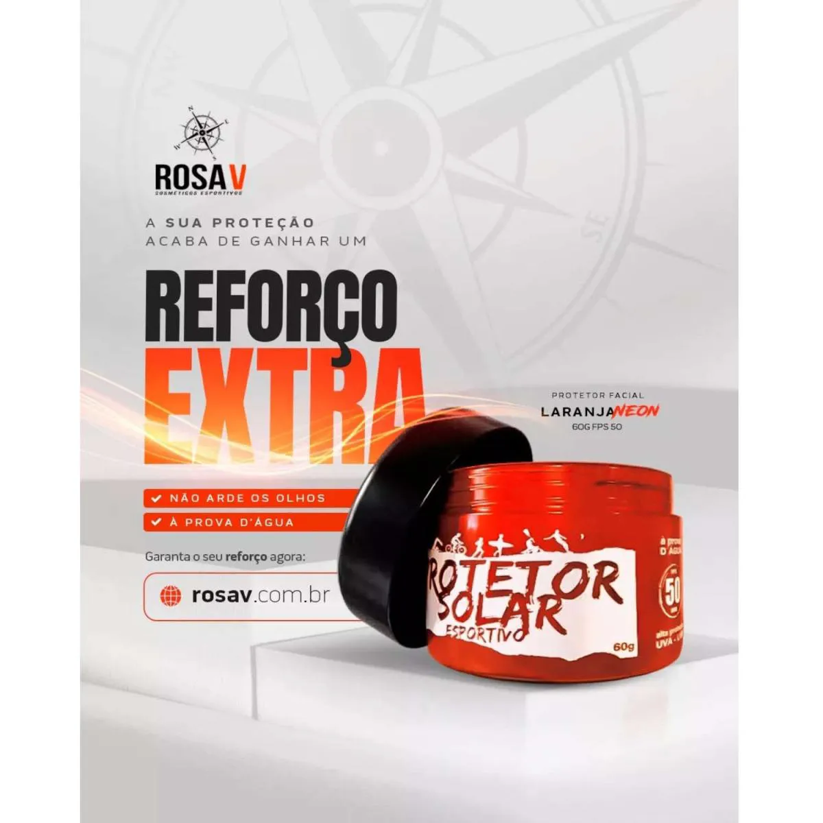 O Protetor Solar Facial Rosa dos Ventos é um produto de proteção solar com FPS 50, desenvolvido na cor laranja neon, destinado a proteger a pele contra os raios UVA e UVB durante atividades ao ar livre. Trata-se de um protetor solar hipoalergênico, vegano, à prova d'água e dermatologicamente testado, formulado para oferecer alta proteção solar com conforto e estilo.