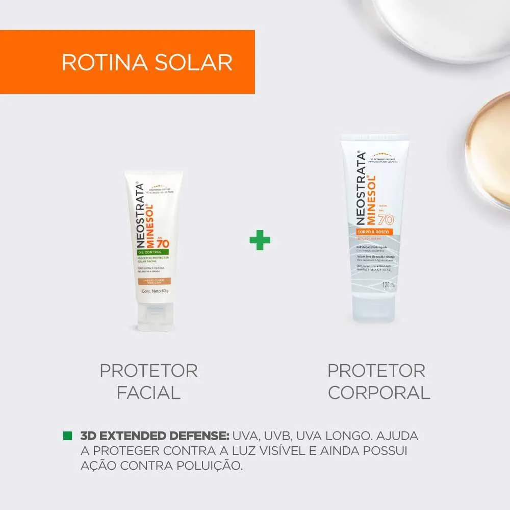 O Protetor Solar Facial Neostrata Minesol Oil Control é um protetor solar com fórmula colorida desenvolvida especialmente para peles brasileiras, que oferece proteção avançada contra raios solares e poluição. Serve para proteger a pele contra danos solares, controlar a oleosidade, prevenir o envelhecimento precoce e uniformizar a aparência da pele, proporcionando cobertura de longa duração com efeito matificante e blur.