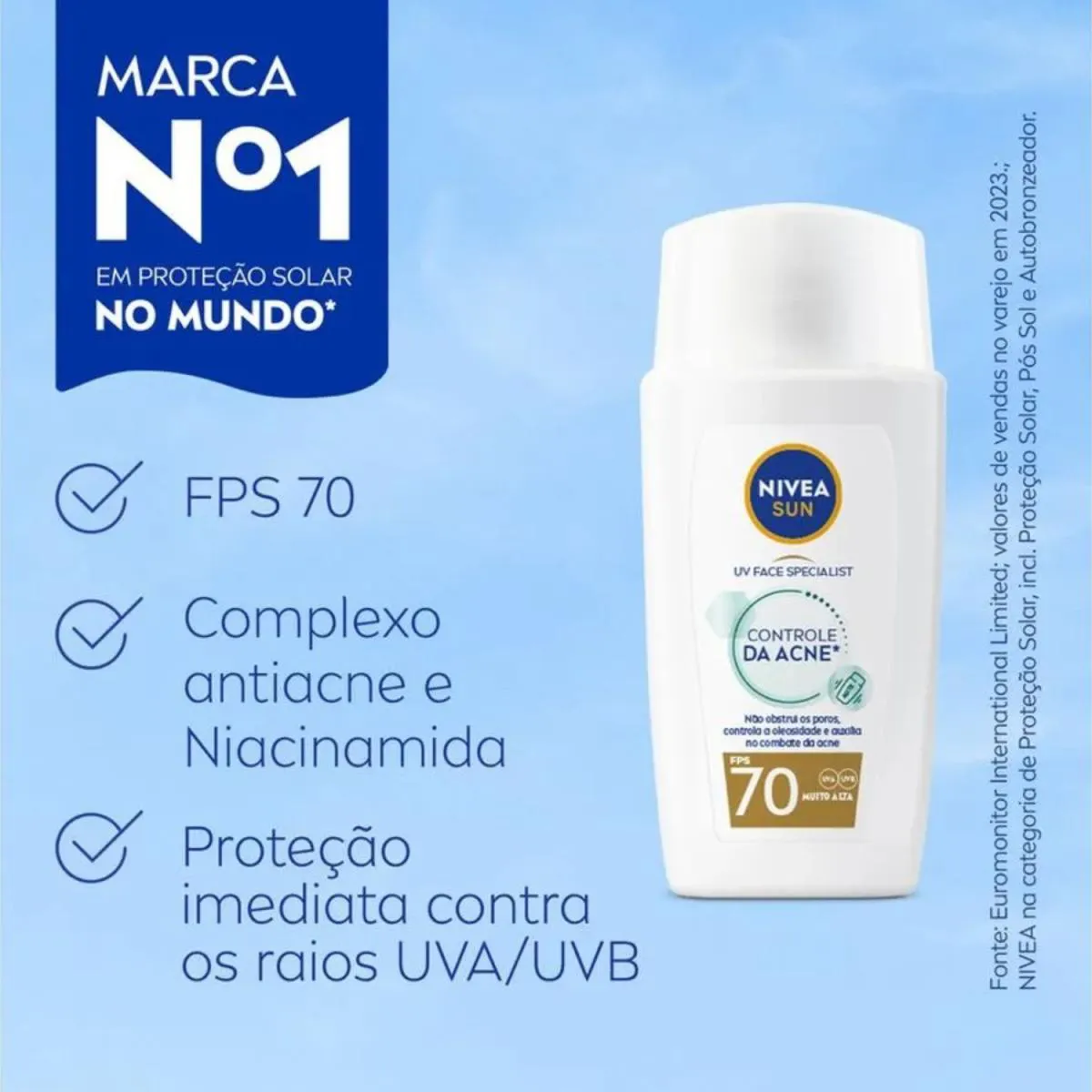 NIVEA Sun UV Face Specialist Controle da Acne FPS 70 40ml é um protetor solar recomendado para pele oleosa e propensa a acne com alta proteção, complexo anti-acne e Niacinamida que oferece cuidado diário superior para uma pele saudável. Além de oferecer proteção contra os efeitos causados pela luz como o envelhecimento precoce, o fluido leve e suave não obstrui os poros, é não oleoso e não pegajoso, proporcionando um efeito matte de 8 horas para um visual sem brilho, sensação de pele hidratada e uma aparência visivelmente saudável. Produto testado dermatologicamente e oftalmologicamente. Recomendado para pele oleosa e propensa a acne, ele oferece proteção por dentro graças ao Licochalcona A, um poderoso antioxidante natural que ativa o mecanismo de defesa da pele, protegendo a nível celular e por fora contra os raios UVA/UVB, auxiliando na redução do estresse oxidativo dos radicais livres causados pela luz visível e poluição. Produto não comedogênico, clinicamente testado. *Licochalcona A, um antioxidante que atua a nível celular e auxilia na redução do estresse oxidativo da pele induzido pela exposição à luz visível e poluição.