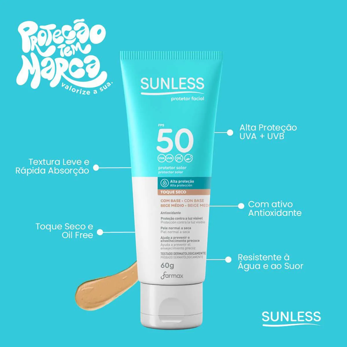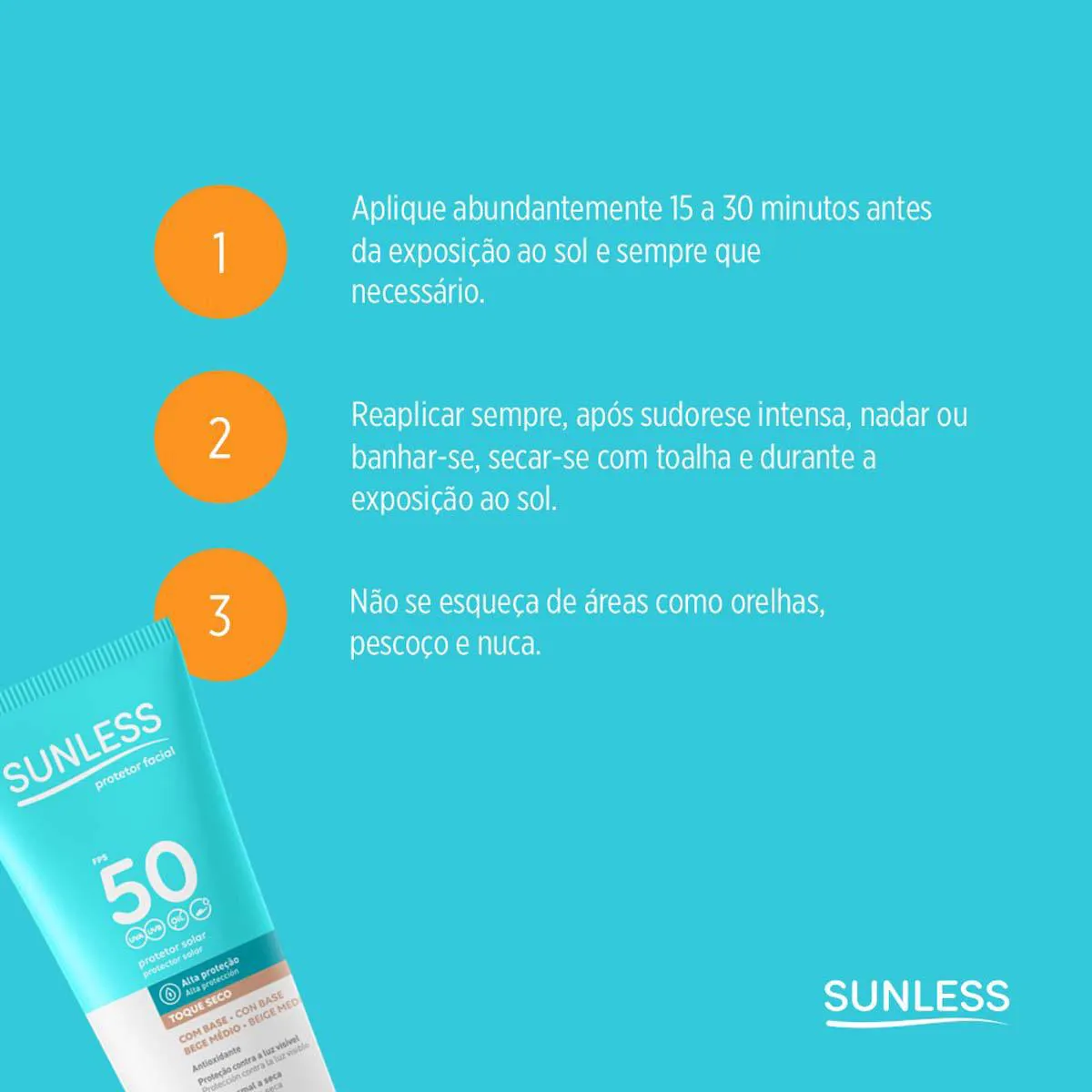 Sunless Toque Seco é um protetor solar facial de tonalidade média desenvolvido para todo tipo de pele, inclusive as mais sensíveis à queimadura solar. Possui alta proteção, FPS 50, contra raios solares UVA e UVB. Sua textura é agradável, possui toque seco e é resistente a água e suor, além de auxiliar no combate aos radicais livres e ao envelhecimento precoce. Dermatologicamente testado e livre de parabenos.