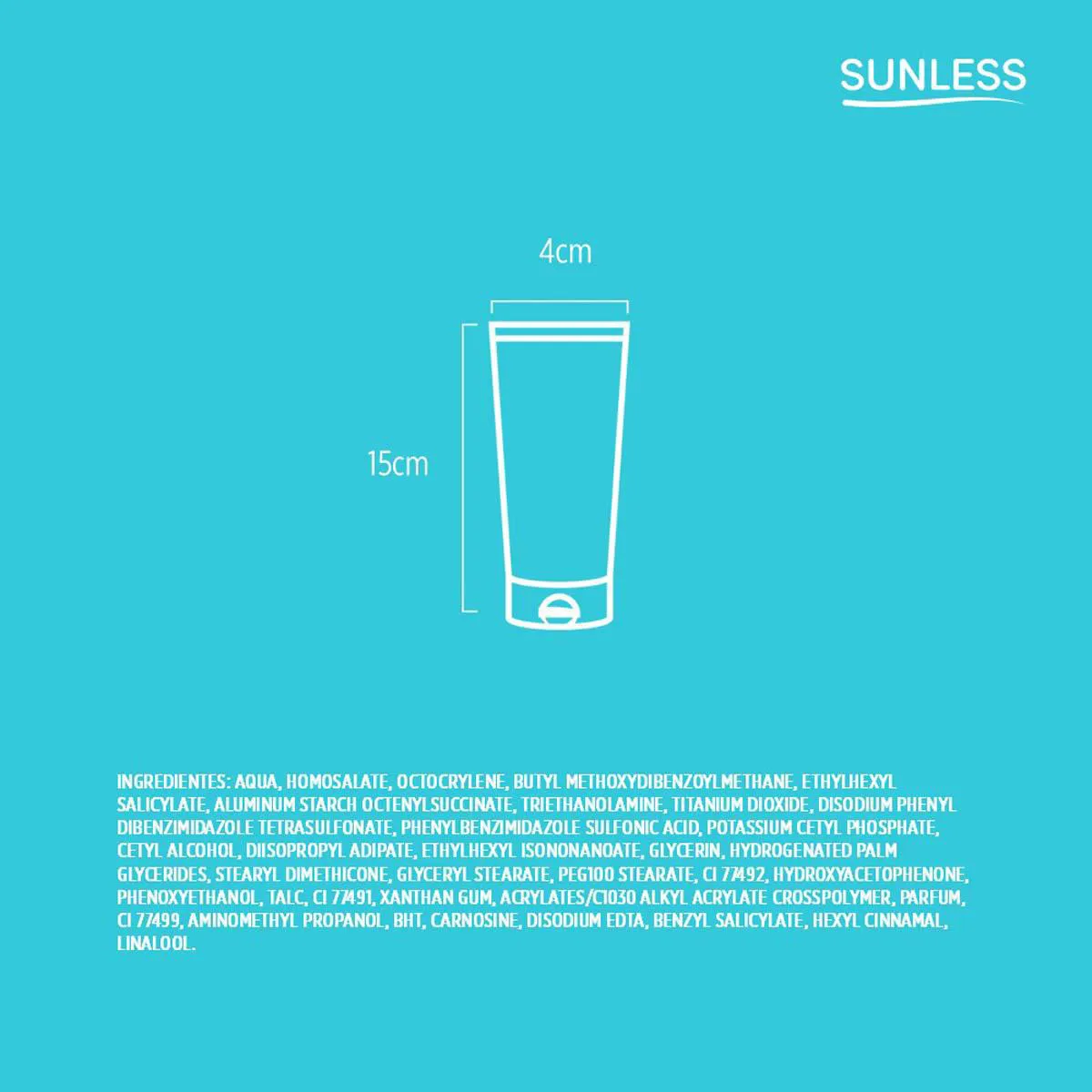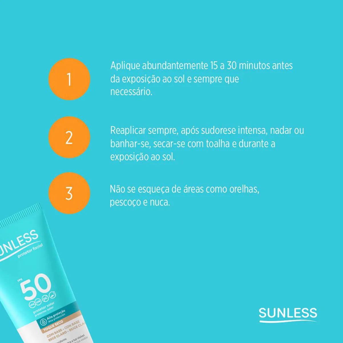 Sunless Toque Seco é um protetor solar facial de tonalidade clara desenvolvido para todo tipo de pele, inclusive as mais sensíveis à queimadura solar. Possui alta proteção, FPS 50, contra raios solares UVA e UVB. Sua textura é agradável, possui toque seco e é resistente a água e suor, além de auxiliar no combate aos radicais livres e ao envelhecimento precoce. Dermatologicamente testado e livre de parabenos.