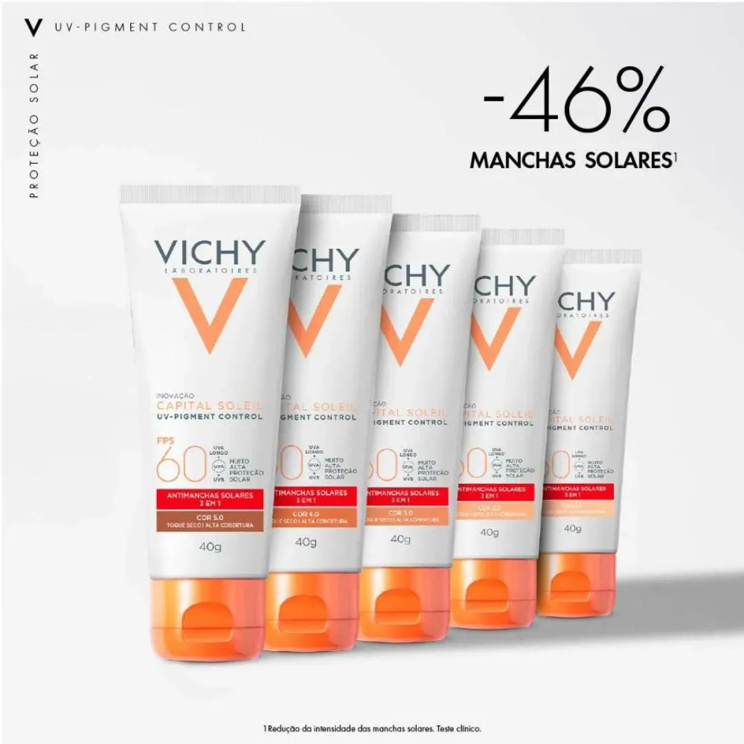 O Vichy UV Pigment Control FPS 60 é um protetor solar facial antimanchas desenvolvido para oferecer alta proteção contra os raios UVA e UVB, ajudando a prevenir e clarear manchas solares e de hiperpigmentação. Sua fórmula contém água vulcânica de Vichy, que, junto ao toque seco e à textura leve, oferece proteção eficaz sem deixar resíduos oleosos. É ideal para uso diário em todos os tipos de pele, inclusive oleosas e sensíveis, e foi desenvolvido para a pele brasileira.