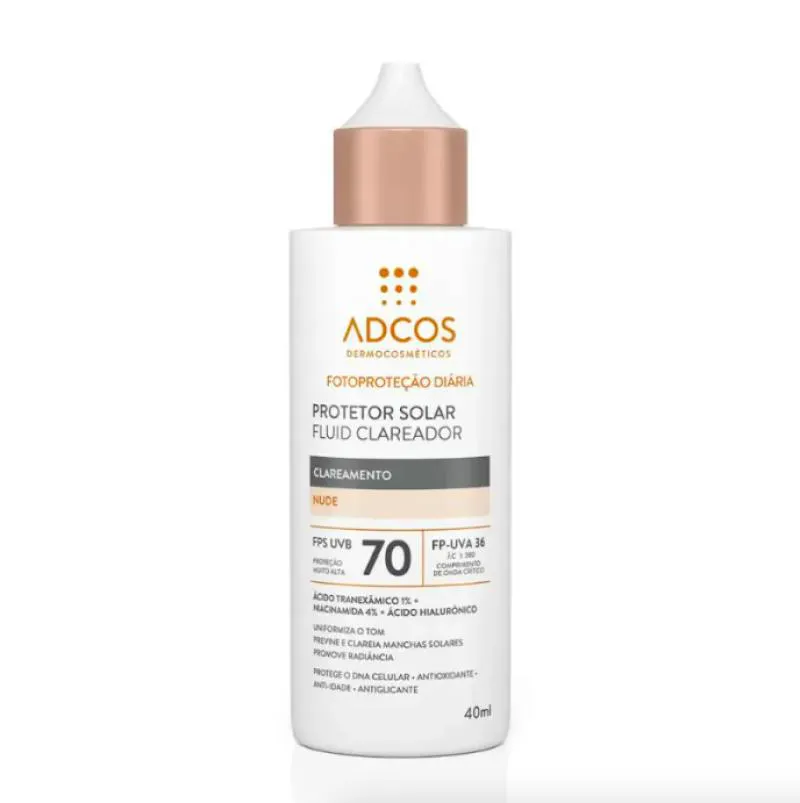 O Protetor Solar Fluid Clareador FPS 70 oferece muito alta proteção de amplo espectro contra os raios UVB, UVA, UVA longo, luz visível (nas versões com cor) e radiação infravermelha. Sua fórmula foi desenvolvida especialmente para prevenir e tratar manchas, uniformizar o tom da pele, reduzir rugas e poros e proporcionar uma pele visivelmente mais clara, uniforme e luminosa.Sua potente ação clareadora atua em diferentes etapas da formação da melanina, graças à associação de 1% de Ácido Tranexâmico, 4% de Niacinamida e Ácido Salicílico, que atuam sinergicamente na prevenção e correção das hiperpigmentações.A presença de Niacinamida, Ácido Hialurônico e vitamina e também contribui para manter a hidratação da pele, fortalecer a barreira cutânea e proporcionar ação antioxidante.Sua textura fluida garante rápida absorção, não escorre, não arde os olhos e é resistente à água. Indicado para todos os tipos de pele.