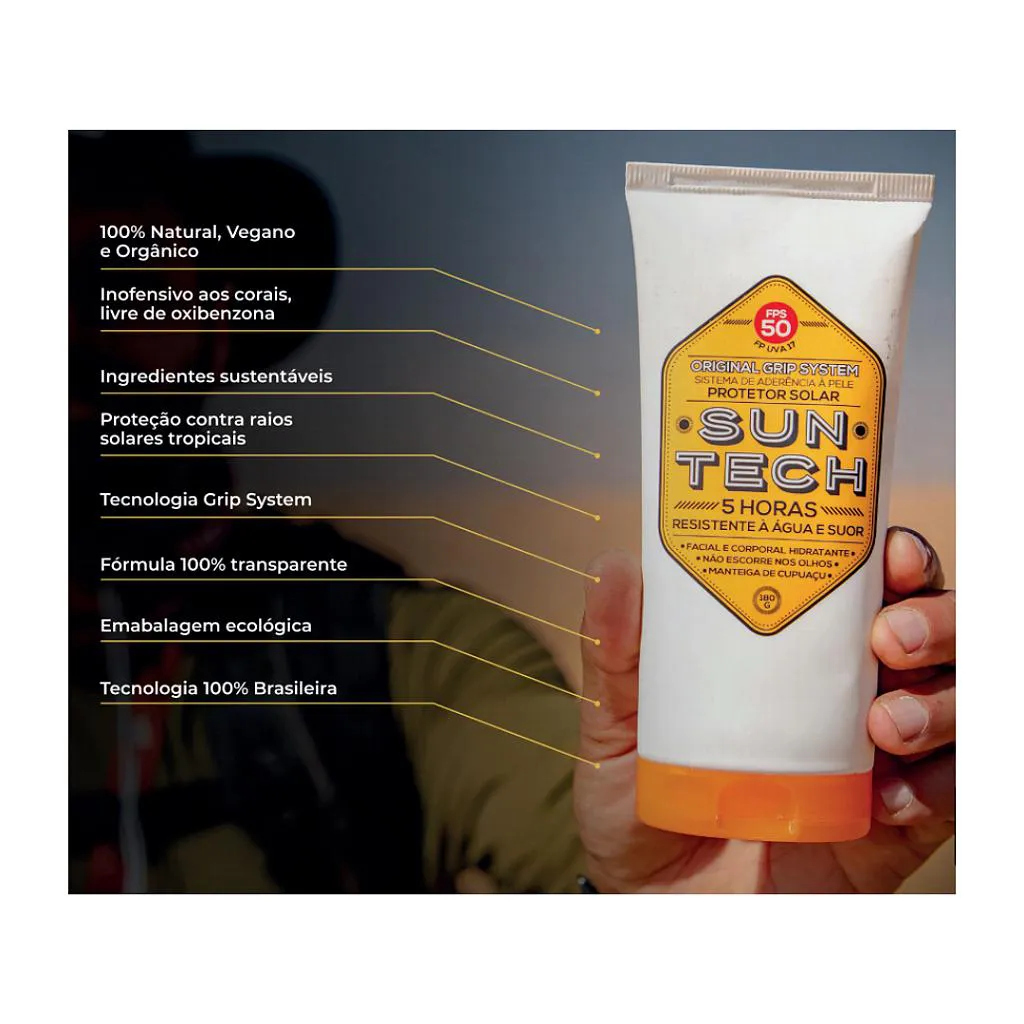 Além disso, o Suntech é resistente à água e suor por até 300 minutos, proporcionando durabilidade e conforto em qualquer situação. É também livre de oxibenzona e octinoxato, sendo seguro para você e para os oceanos.