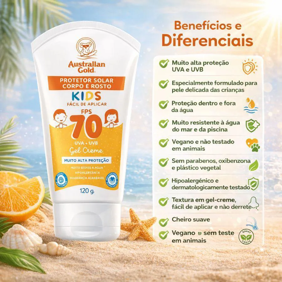 protetor solar Australian Gold Kids FPS 70 120g O Protetor Solar Australian Gold Kids FPS 70 foi desenvolvido especialmente para proteger a pele delicada das crianças. Ideal para corpo e rosto, ele possui muito alta proteção UVA e UVB, protege dentro e fora da água e é super fácil de aplicar. Indicado para peles sensíveis à queimadura solar, Australian Gold Kids é enriquecido com vitamina e e Ameixa de Kakadu e garante hidratação por 24 horas, deixando a pele macia a partir de sua textura leve em gel creme. Sua fórmula é muito resistente à água, possui absorção imediata, fragrância agradável, além de ser hipoalergênica e pediatricamente testada. Benefícios e diferenciais -Muito alta proteção contra os raios UVA e UVB. -Especialmente formulado para a pele delicada das crianças. -Muito resistente à água do mar e da piscina -Oferece muito alta proteção contra queimaduras solares, é indicado para pele extremamente sensível à queimadura solar -Cheiro suave. -Textura em gel-creme e fácil de aplicar. -Proteção dentro e fora da água. -Não derrete. -Vegano e sem teste em animais. -Sem parabenos, oxibenzona e plástico vegetal. -Hipoalergênico e dermatologicamente testado.