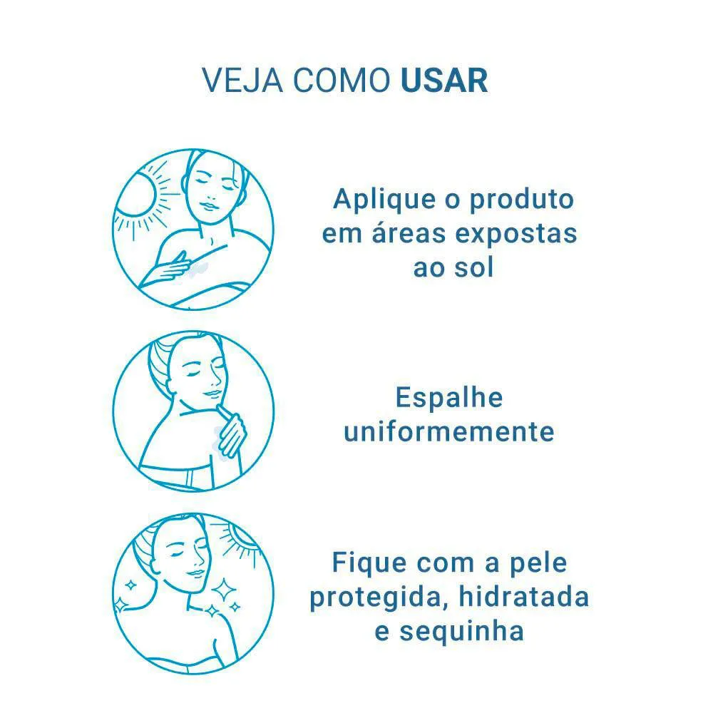 Aplique abundantemente antes da exposição ao sol. É necessária a reaplicação do produto para manter sua efetividade. Reaplicar sempre, após sudorese intensa, nadar ou banhar-se, secar-se com toalha e durante a exposição ao sol. Para fechar, pressione o centro da tampa.