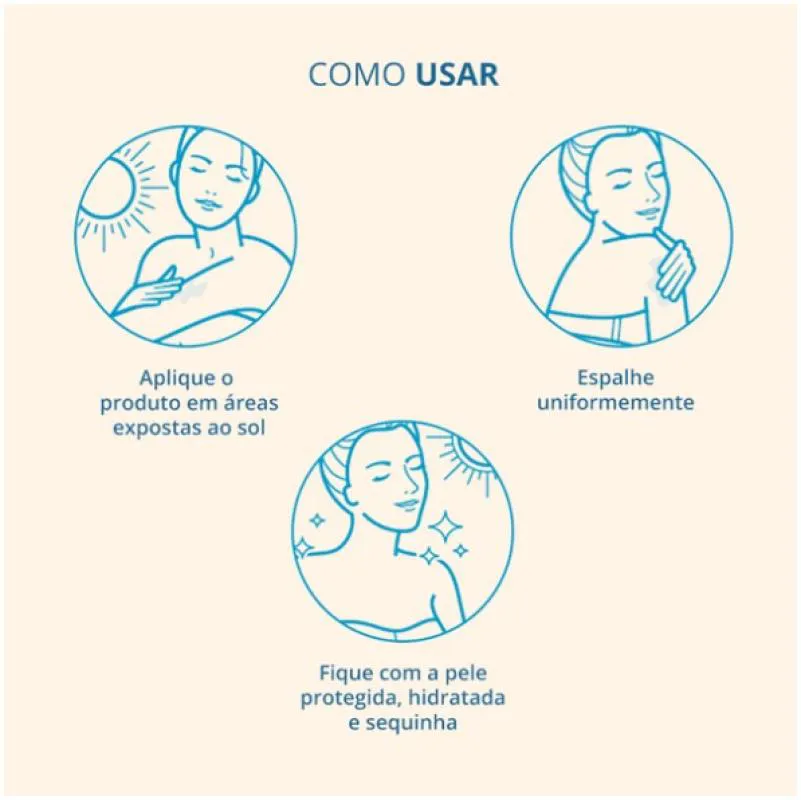 - Aplique generosamente sobre todas as áreas do corpo expostas ao sol, cerca de 15-20 minutos antes da exposição solar.