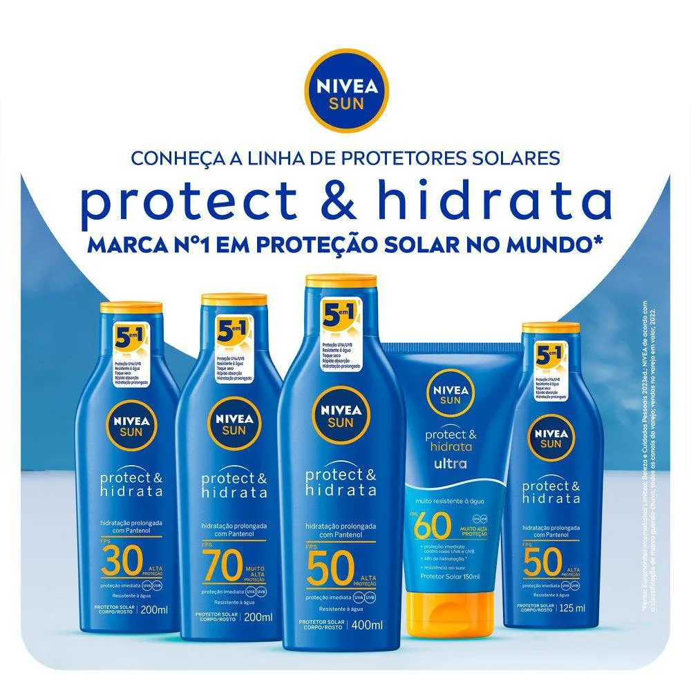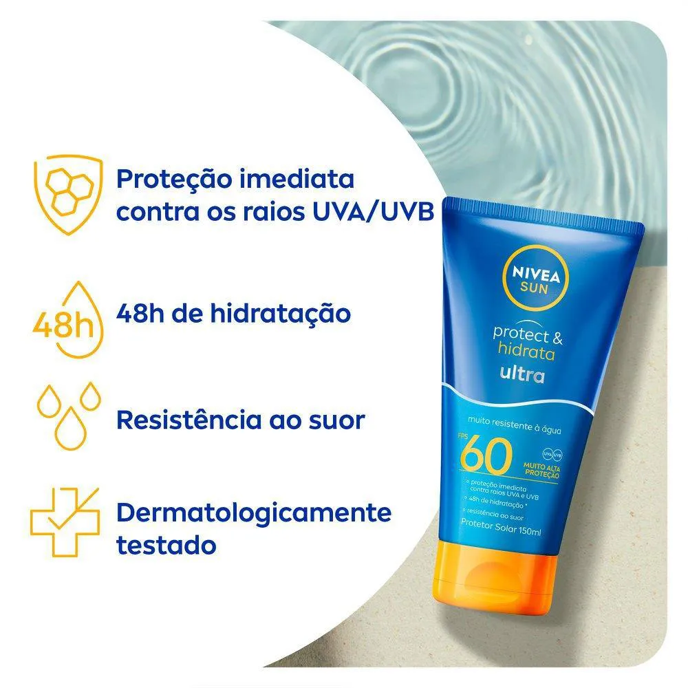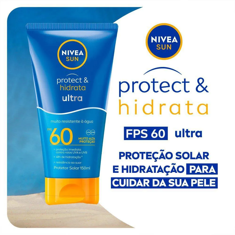 Para que serve? NIVEA SUN Protect & Hidrata Ultra FPS 60 150ml oferece uma proteção ultra* contra queimaduras solares, indicado para a pele extremamente sensível. Além de ter tecnologia que promove resistência à água e ao suor, aumentando sua eficácia. *Comparado a um protetor solar NIVEA Sun Protect & Hidrata regular.
