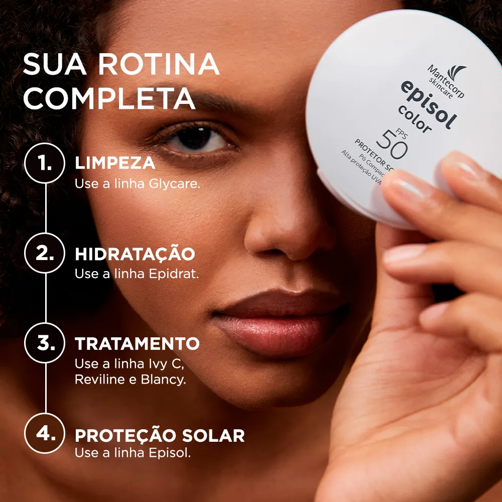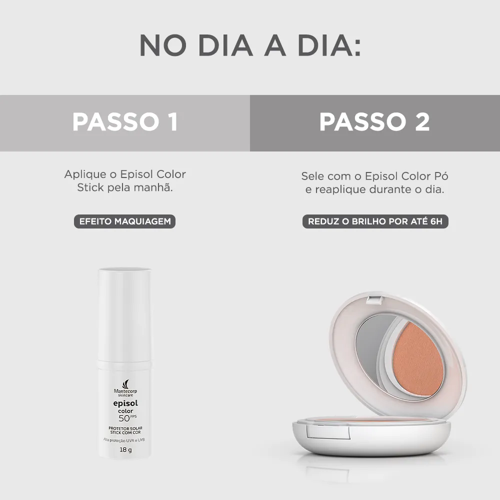 O Episol Color Pó Compacto é um protetor solar com cor em formato de pó, disponível em diferentes tonalidades para diversos tons de pele. Serve para proteger a pele contra raios solares, uniformizar o tom da pele e realizar reposição e reforço da maquiagem durante o dia, oferecendo cobertura com FPS 50.