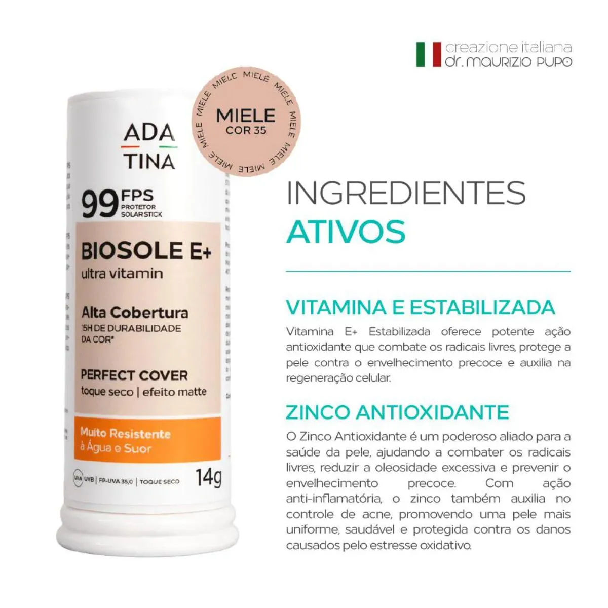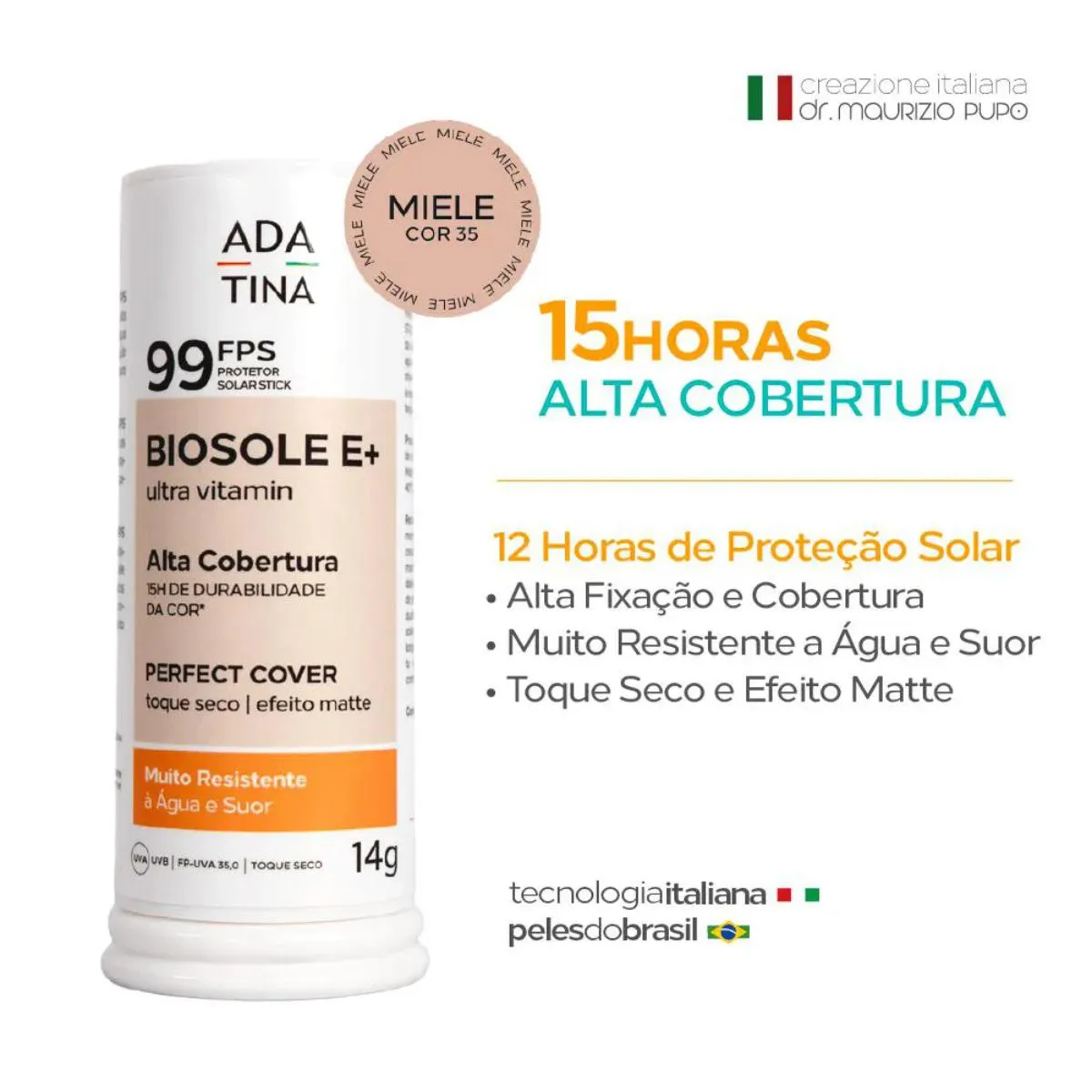 Protetor Solar Stick 12Hs é um protetor solar com cor, com 15 horas de alta cobertura e durabilidade da cor, muito resistente à água e suor, especialmente indicado para peles mais sensíveis ao Sol.Biosole E Plus Ultra Vitamin FPS 99 Stick possui alta cobertura contra as imperfeições, alta fixação, alta durabilidade, baixa transferência, toque seco e acabamento matte.