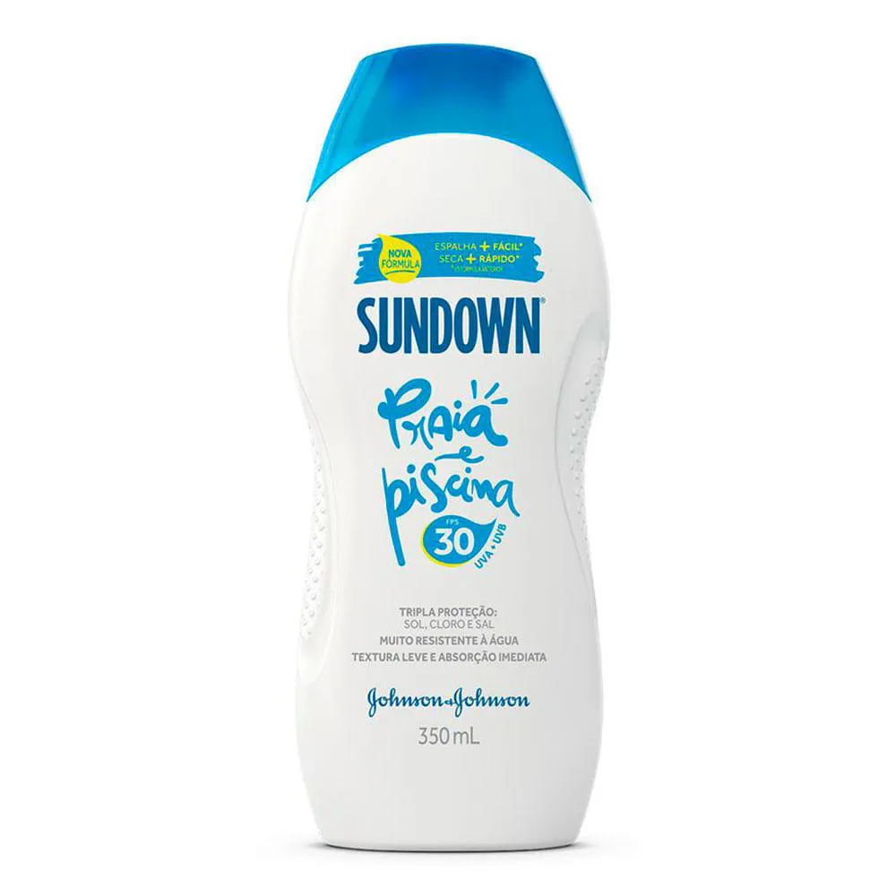 O protetor solar Sundown Praia e Piscina FPS 30 está disponível nas novas embalagens de 120 mL, 200 mL e 350 mL com duplo dosador — para o corpo e para o rosto.
