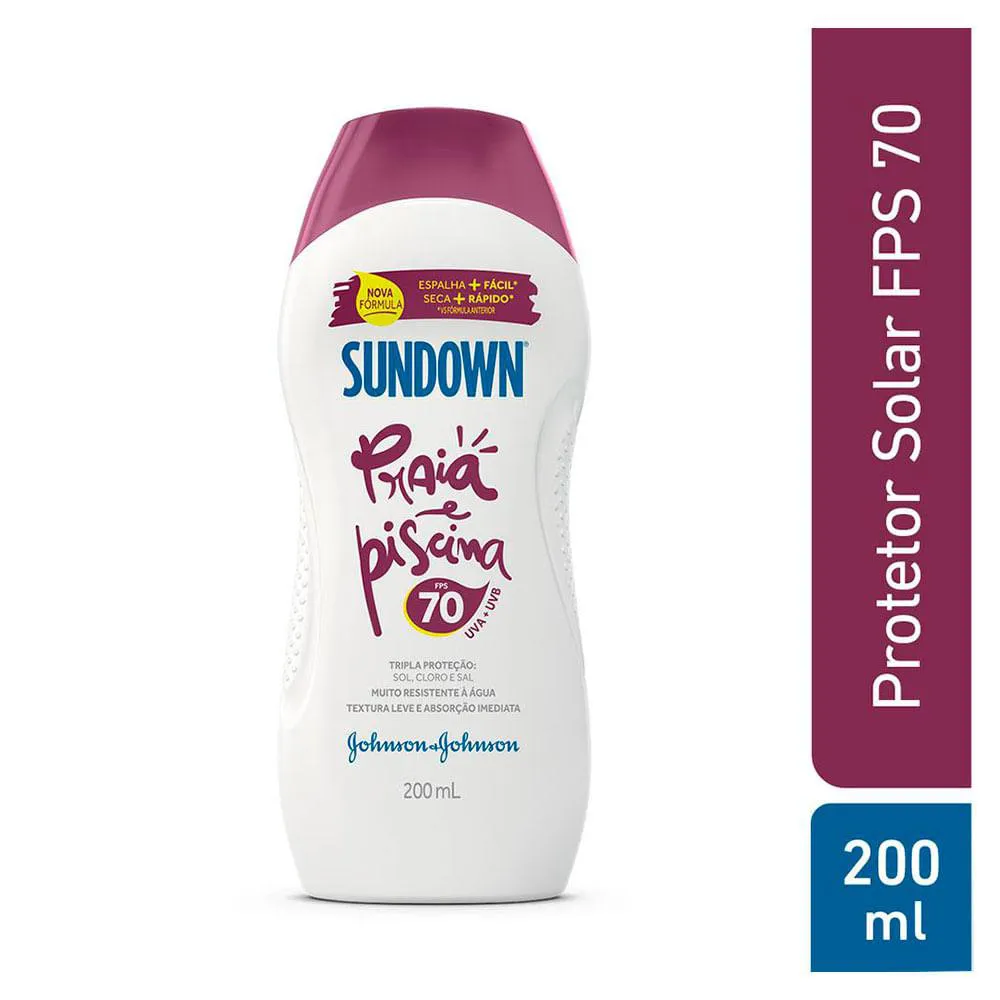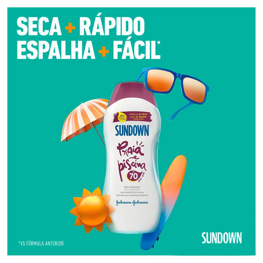 O protetor solar Praia e Piscina FPS 70, da Sundown, conta com tripla proteção, ajuda a proteger a pele de elementos agressores como o sol, cloro e a água salgada do mar.