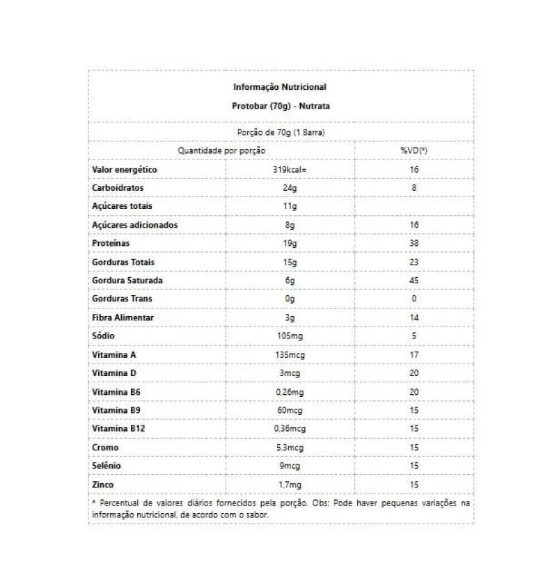 ProtoBar - Nutrata A Protobar é uma barra de proteína composta por diferentes fontes proteicas. Fonte natural de aminoácidos de cadeia ramificada (BCAAs) é rica em proteínas de alto valor biológico e prática, proporcionando uma opção nutritiva e saborosa para as refeições intermediárias ao longo do dia. É adicionada da fibra reguladora mais moderna do mercado (Orafti®, Synergy1), 100% natural, de propriedades prebióticas que estimula o trânsito intestinal e modula a flora para manutenção de boa função digestiva e imunológica. Diferenciais de Qualidade:* Adicionado de vitaminas e minerais;* Alto teor proteico cerca de 19g por 70g de produto;* Aporte de fibra prebiótica (Orafti®, Synergy1);* Adicionado de vitamina D3, ação fotoprotetora.