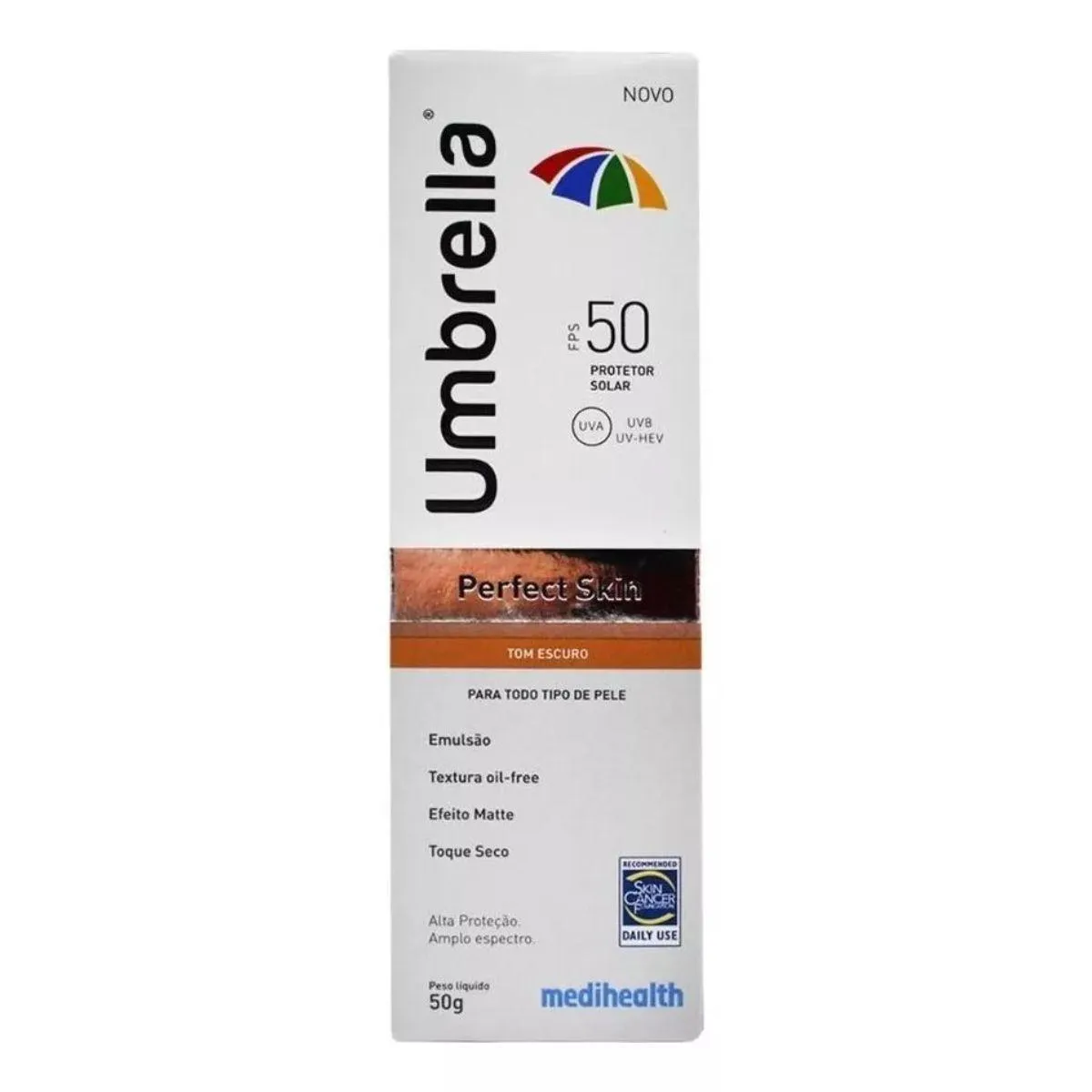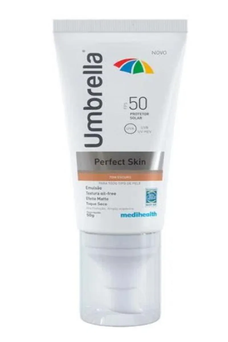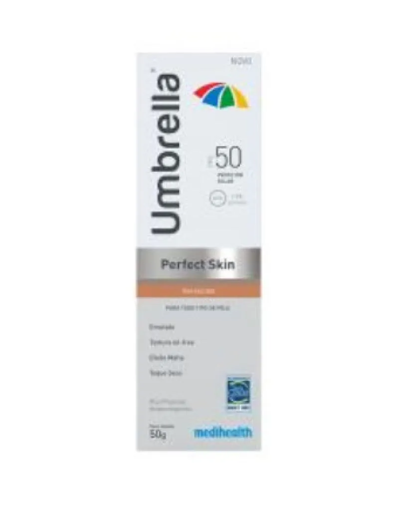 Umbrella Perfect Skin FPS50 é um fotoprotetor facial que disfarça as imperfeições da pele e áreas avermelhadas.