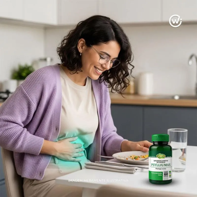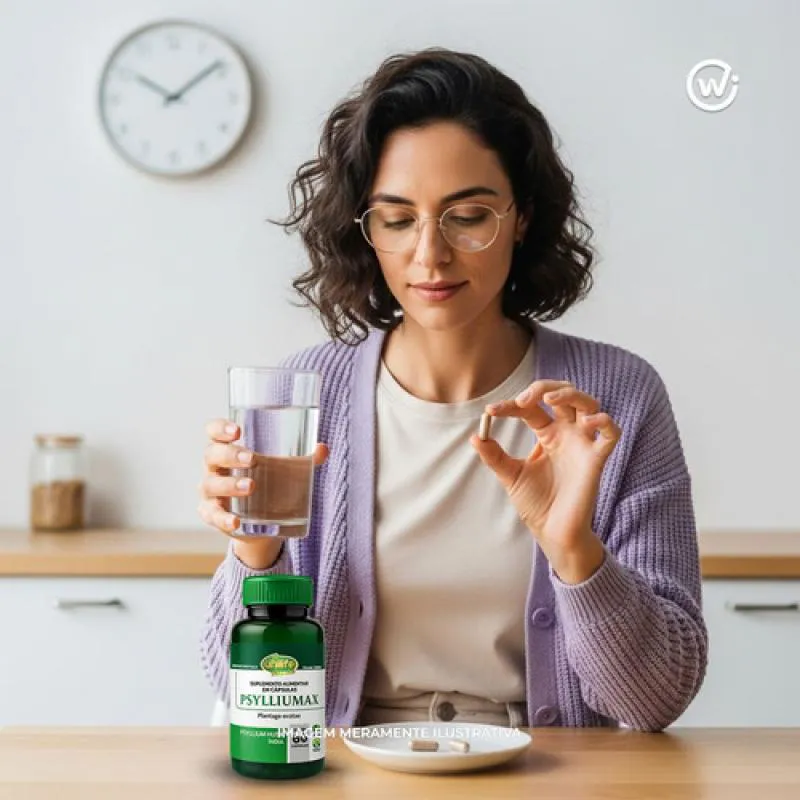 Fibra natural vegana (psyllium) em cápsulas, prática para o dia a dia. Sem glúten e com cápsula vegetal. Foco em ingestão adequada de fibras, contribuindo para rotina intestinal e saciedade, sem promessas exageradas.
