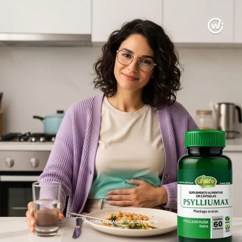 fibras 100% vegetais em cápsulas, feito a partir da casca de Plantago ovata (psyllium). Prático para o dia a dia, ajuda a aumentar a ingestão de fibras na alimentação e pode ser incorporado facilmente à rotina sem preparo. Produto vegano e sem glúten.