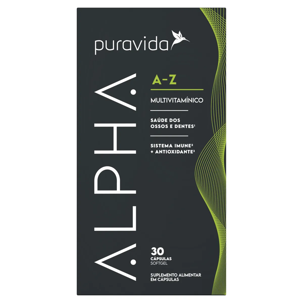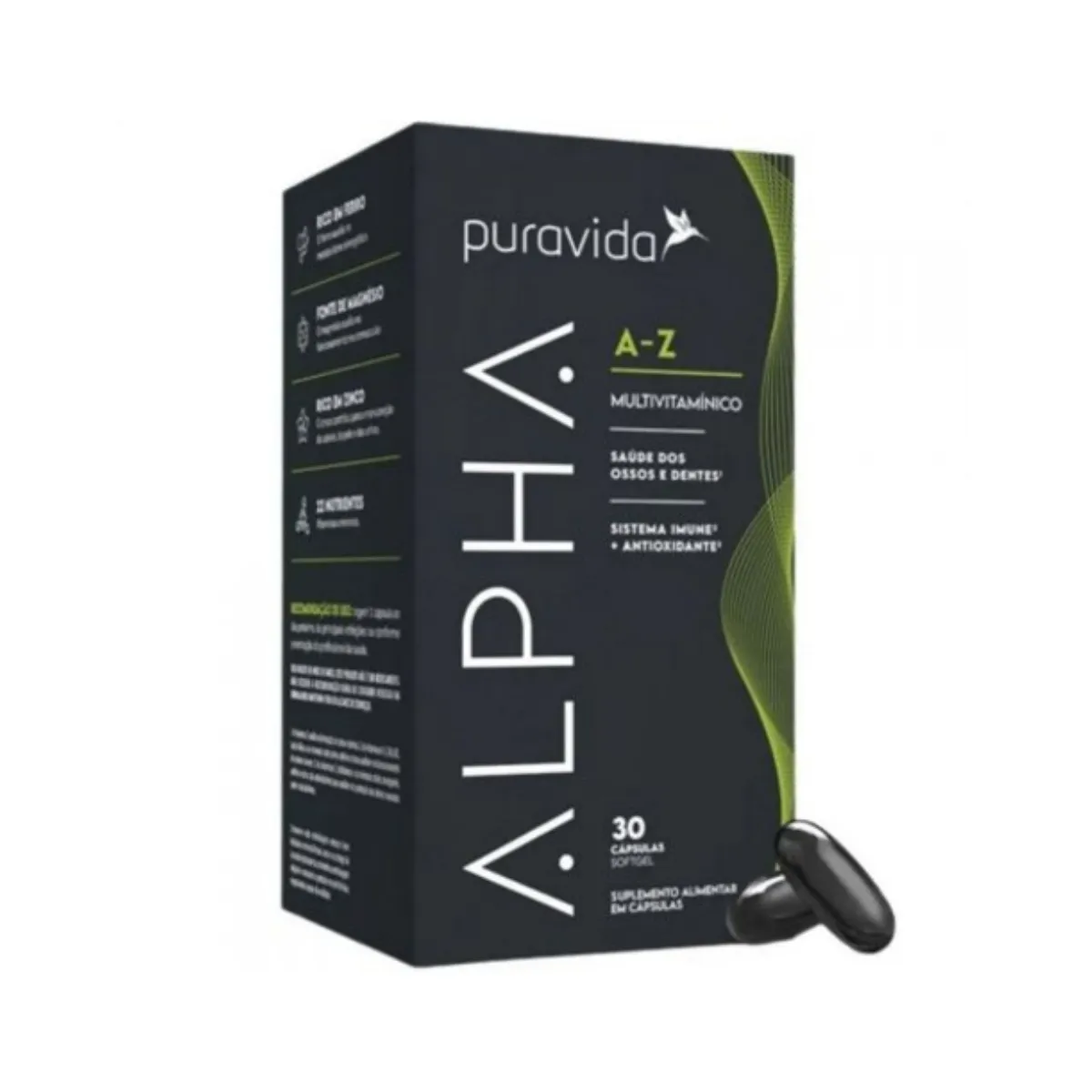Alpha A-Z Puravida é um suplemento alimentar multivitamínico em cápsulas, com excelente biodisponibilidade e disponível em embalagem de 30 cápsulas. Ele desempenha um papel fundamental no funcionamento do sistema imune, no metabolismo energético, na manutenção de ossos, dentes, cabelo, pele e unha e no processo de divisão celular.