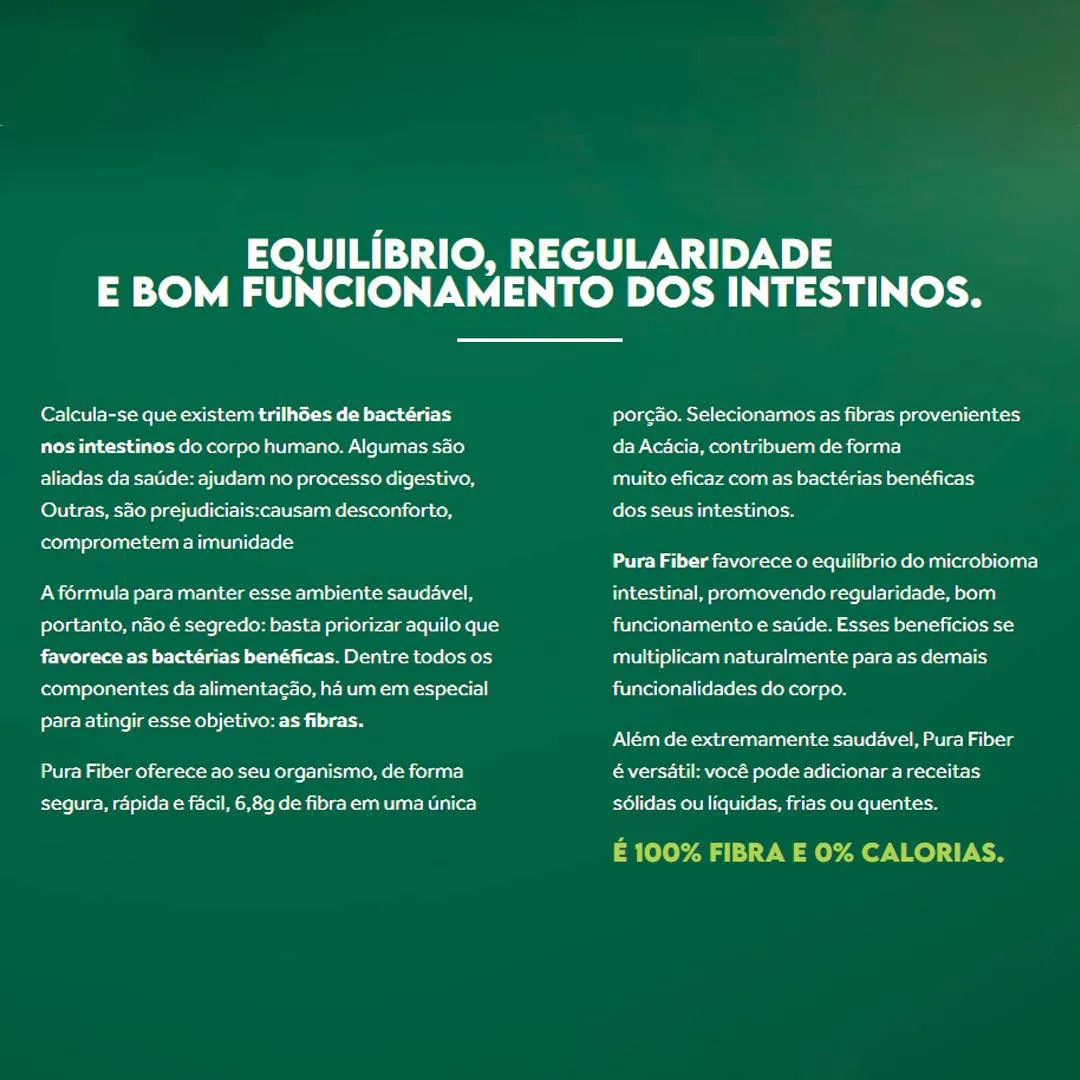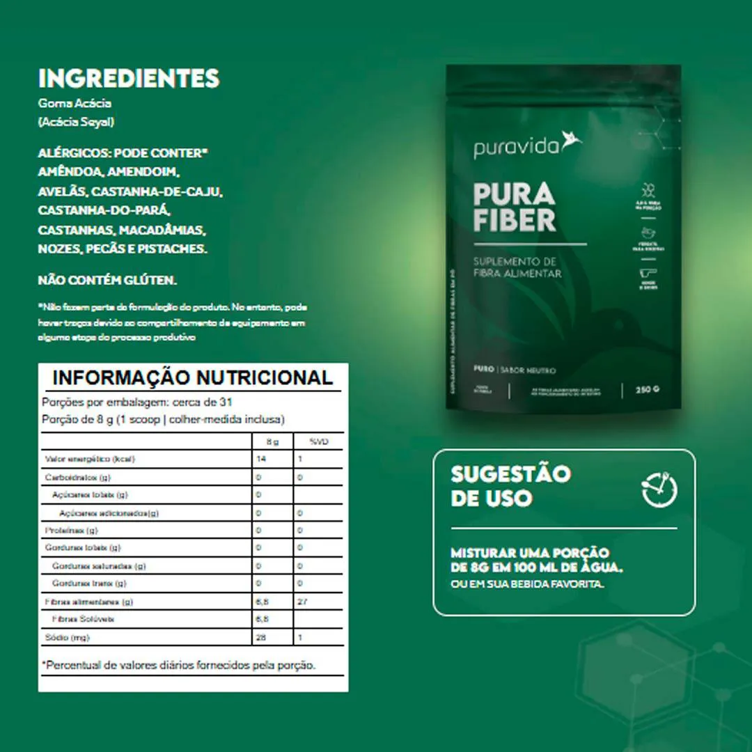 Purafiber da Puravida é um suplemento alimentar de fibra solúvel, desenvolvido a partir da goma de acácia (Acácia Seyal), considerada uma das fontes de fibra prebiótica mais estudadas e bem toleradas.