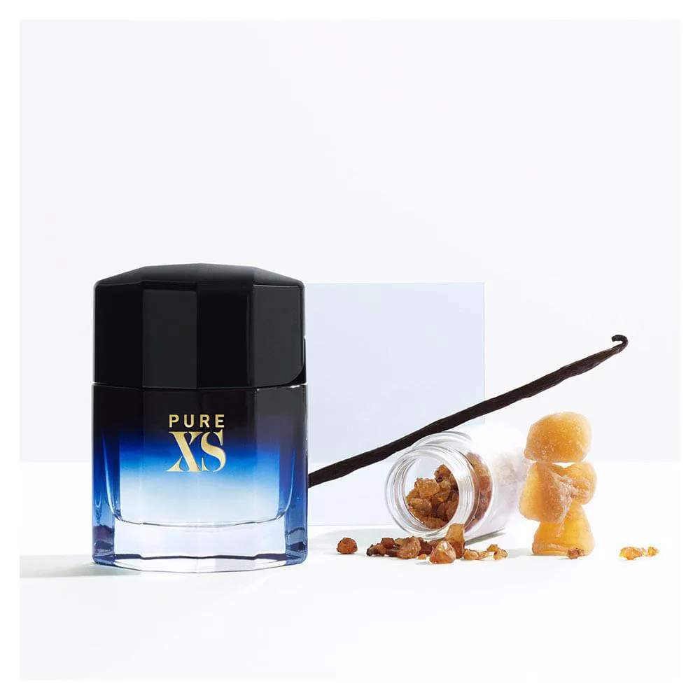 XS revela o sexo e o excesso do personagem no centro da história; as reações que ele incita e a fragrância que oscila entre o frescor e o fogo. Pure XS é um oriental vibrante, magnético e refrescante, alternando permanentemente entre frio e calor, suave e intenso. Duas sensações no limite, roçando-se, atraindo-se e ecoando entre si. O primeiro excesso: frescor explosivo. Durante esta preliminar, os sentidos ficam selvagens e o paladar fica dormente com uma overdose de gengibre quase gelado. Uma mordida saborosa, deliciosa, provocante, afrodisíaca. Uma segunda brisa carnal: a cremosidade verde da seiva vegetal e do tomilho ultramasculino.