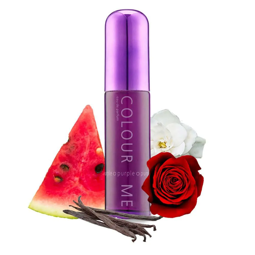 Purple Colour Me Femme é uma fragrância elegante, rico e frutal esta fina fragrância frutada combina elegância e riqueza com ingredientes modernos para criar um perfume clássico para mulheres. Um sutil acorde floral é cuidadosamente tecido entre camadas de bergamota e melancia, musgo de carvalho e âmbar.
