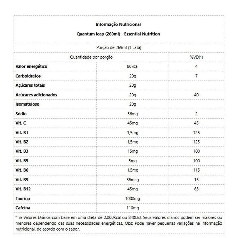 Quantum Leap Ginger Lemon (269ml) - Essential Nutrititon Experimente algo totalmente ! Quantum Leap é uma bebida refrescante e levemente gaseificada diferente de tudo que você já provou, elaborada com ingredientes naturais altamente eficientes que promovem foco, concentração e recuperação muscular. Quantum Leap é uma alternativa aos refrigerantes ou bebidas energéticas cheias de açúcar e estimulantes artificiais. Na física quântica, quando uma partícula recebe uma quantidade extrema de energia, ela salta para um nível superior. Esse salto é chamado de Quantum Leap! CONHEÇA POR DENTRO DO QUANTUM LEAP!* Combinação única de Ingredientes: guaraná, chá verde, gengibre orgânico e gengibre tailandês, L-Taurina, Palatinose e D-Ribose;* Blend de vitaminas;* Fonte de fitonutrientes (polifenóis, catequinas, cafeína natural, gingeróis, metilxantinas);* Ingredientes com certificação NON-GMO, Kosher e Halal;* Vegano;* Sem glúten;* Sem lactose;* Sem conservantes;