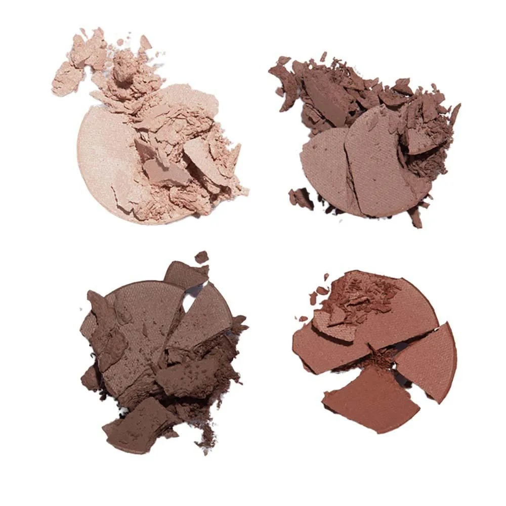 São três tons democráticos de sombra (pra pelos claros, médios e ruivos) e um iluminador universal.
