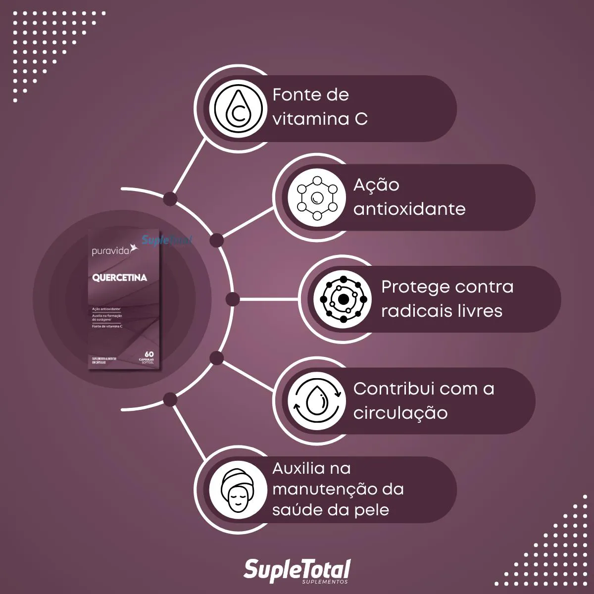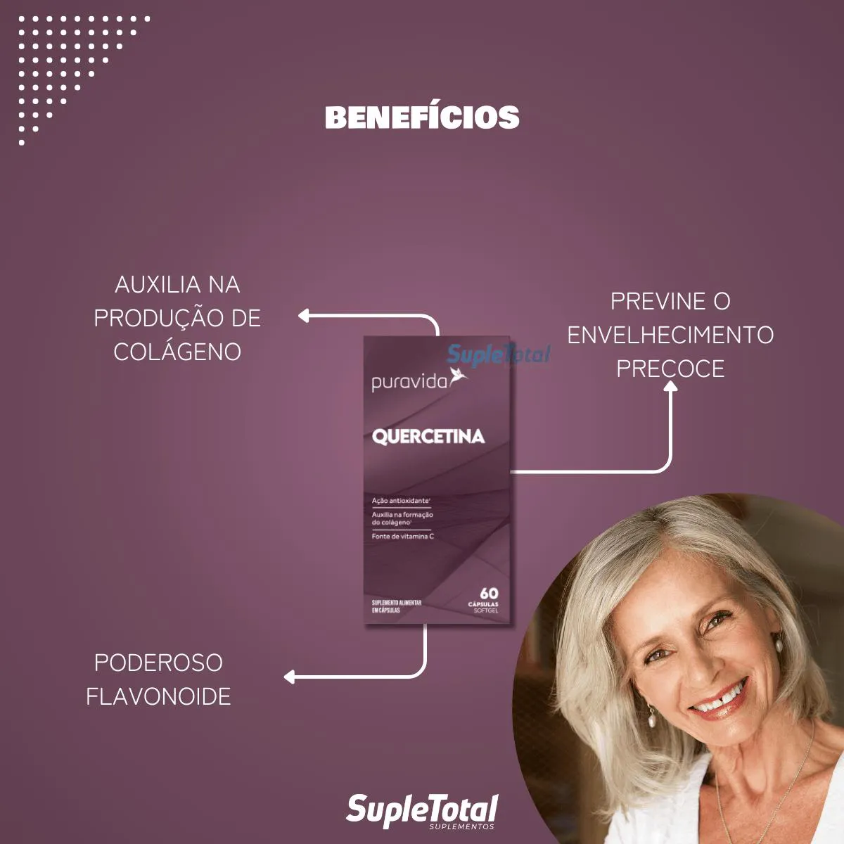 A Quercetina da Puravida também tem sua fórmula enriquecida com vitamina C, fundamental para a produção de colágeno, nutriente que auxilia na manutenção da saúde da pele.