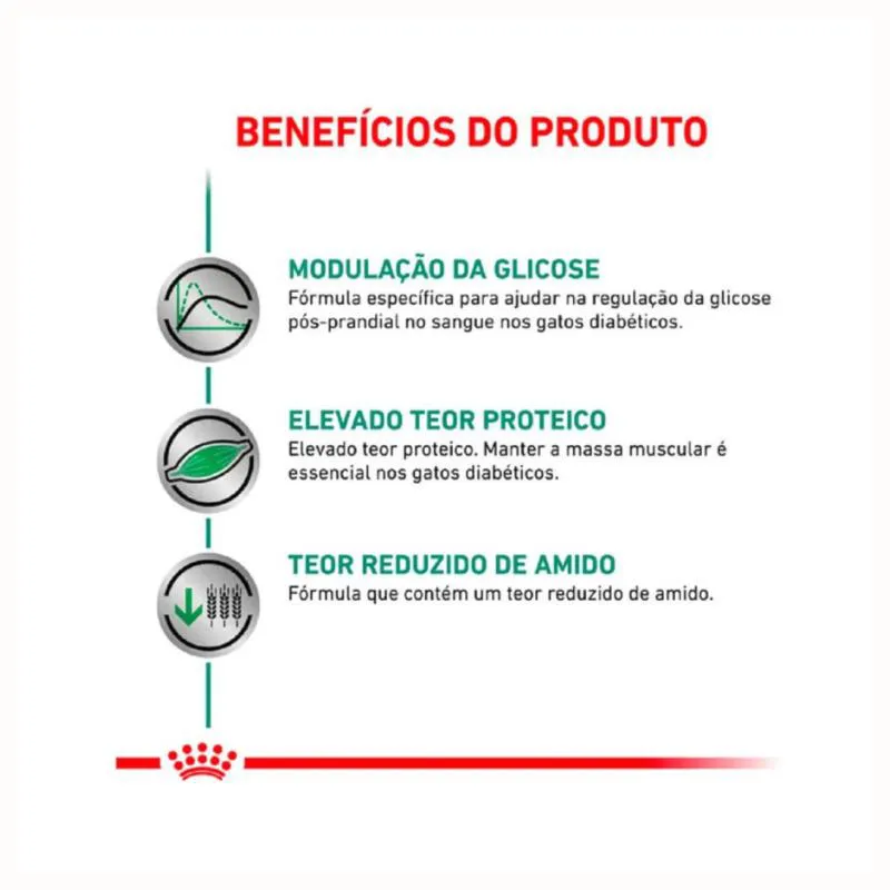 O manejo do diabetes mellitus em gatos exige um controle rigoroso da ingestão de carboidratos para evitar picos de glicemia após as refeições. A Royal Canin Diabetic é um alimento coadjuvante de alta tecnologia, desenvolvido especificamente para auxiliar no controle dos níveis de açúcar no sangue dos felinos.Sua fórmula exclusiva possui um baixo índice glicêmico e é rica em proteínas, garantindo que o seu gato mantenha a massa muscular enquanto o organismo processa a energia de forma lenta e constante, proporcionando mais segurança e qualidade de vida ao pet.Destaques e Beneficios Principais: