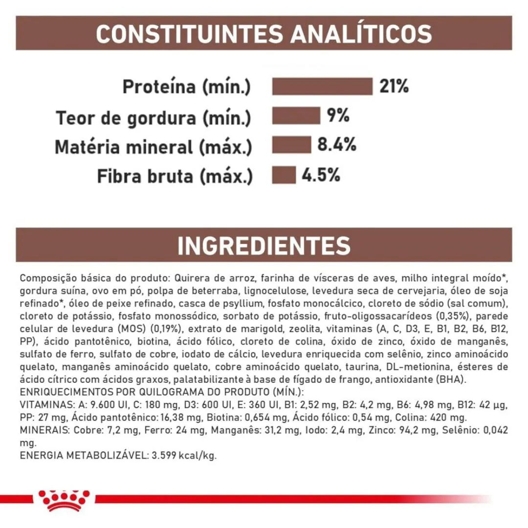 Ração Royal Canin Veterinary Diet Gastrointestinal Moderate Calorie para Cães Adultos 2,0kg Pet: Cães; Idade: Adultos e idosos; Linha: Veterinary Diet; Tipo de Ração: Super Premium; Porte de Raça: Pequenas, médias e grandes; Tamanho de grão: Pedaços médios; Corante: Sem corante; Transgênico: Sem transgênico; Código de barras: 7896181216537. Quais os benefícios da Ração Royal Canin Veterinary Diet Gastrointestinal Moderate Calorie? Gastro Intestinal Moderate Calorie é um alimento dietético completo para o manejo nutricional de cães, formulado para reduzir distúrbios agudos de absorção intestinal e como compensação de má digestão. Ingredientes altamente digeríveis. Aumento do nível de eletrólitos. Baixo nível de gordura. Seu teor calórico moderado o torna particularmente adequado para cães em que o peso ideal é difícil de manter (castração / excesso de peso / baixa atividade). Combinação de proteínas altamente digestíveis, prebióticos (fruto-oligossacáridos e mananoligossacáridos), polpa de beterraba, arroz e peixe velho para ajudar a apoiar a segurança digestiva. Um conteúdo calórico reduzido ajuda a limitar o ganho de peso em cães castrados ou com tendência a ganhar peso. A palatabilidade excepcional ajuda a suportar a ingestão espontânea em cães agitados. Os ácidos eicosapentaenóico e docosahexaenóico, ácidos graxos ômega-3 de cadeia longa, ajudam a manter a saúde digestiva. Qual o sabor da Ração Royal Canin Veterinary Diet Gastrointestinal Moderate Calorie? A ração Royal Canin é um alimento Super Premium que não possui um sabor especifico, uma vez que em sua composição possui um mix de carnes adequados a formulação e nutrição específica de cada raça e porte e suas necessidades nutricionais diárias, mas possui uma alta palatabilidade e aroma agradável tanto para gatos quanto para cachorros. Por que a Ração Royal Canin é um alimento Super Premium? Os alimentos Super Premium apresentam um nível nutricional mais elevado, e atendem os requisitos mínimos estabelecidos pelo Conselho de Nutrição Animal, os níveis nutricionais devem estar em equilíbrio entre os níveis mínimos e máximos apresentados pela AAFCO (Association of American Feed Control Officials). A Ração Royal Canin Veterinary Diet Gastrointestinal Moderate Calorie para cachorros adultos foi produzida atendendo todos os requisitos. Esses niveis são determinados pelas pesquisas, que buscam ótimas condições de pelos, desenvolvimento de musculatura e, principalmente, otimização de performance na reprodução e no sistema imunológico. Composição Arroz, carne de ave desidratada, milho, proteínas animais hidrolisadas, gorduras animais, polpa de beterraba, ovo em pó, fibras vegetais, minerais, leveduras, óleo de soja, óleo de peixe, fruto-oligo-sacarídeos, cascas e sementes de psyllium, fermento hidrolisado ( fonte de mano-oligo-sacarídeos), extrato de calêndula (fonte de luteína).