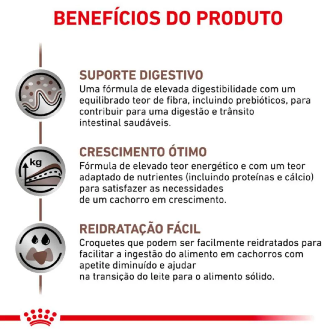 - Energia Elevada: Densidade calórica adaptada para filhotes, permitindo refeições em menor volume para não irritar o estômago sensível.