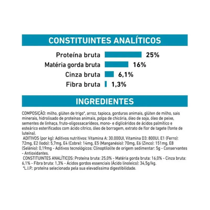 Ração Royal Canin Veterinary Skin Care para Cães Adultos de Porte Pequeno 7,5kg Pet: Cães; Idade: Adultos; Linha: Veterinary; Tipo de Ração: Super Premium; Porte de Raça: Pequenas; Tamanho de grão: Grãos Médios; Corante: Sem corante; Transgênico: Com transgênico; Código de barras: 7896181216506. Descubra a excelência em cuidados dermatológicos com a Ração Royal Canin Veterinary Skin Care para cães adultos de porte pequeno, uma fórmula desenvolvida para proporcionar suporte nutricional à função da pele em situações como dermatoses, atopia e queda de pelo. Dermal Care Para cães com pele sensível, a Ração Royal Canin Skin Care oferece um cuidado específico. Seu teor elevado de ácidos graxos essenciais contribui para o manejo nutricional, promovendo uma pele saudável e resistente a irritações. Aderindo aos mais altos padrões de qualidade, esta ração é um coadjuvante essencial para manter a saúde dermatológica do seu companheiro de quatro patas. Complexo Antioxidante O complexo antioxidante presente na fórmula é um verdadeiro aliado na neutralização de radicais livres. Esta ação sinérgica dos antioxidantes auxilia na preservação da integridade celular, proporcionando um suporte adicional na manutenção da saúde da pele. Ofereça ao seu cão o benefício da proteção contra agentes oxidativos prejudiciais. Barreira Cutânea Reforçada A Ração Royal Canin Skin Care é especialmente formulada para reforçar a barreira protetora natural da pele do seu cão. Este suporte à barreira cutânea é essencial para garantir uma saúde dermatológica ótima, prevenindo problemas e proporcionando conforto ao seu amigo peludo. Saúde Oral Além dos benefícios para a pele, esta ração também cuida da saúde oral do seu cão. Contendo nutrientes específicos, auxilia na manutenção da saúde bucal, contribuindo para dentes fortes e gengivas saudáveis. A Ração Royal Canin Veterinary Skin Care é a escolha perfeita para cães adultos de porte pequeno que necessitam de cuidados dermatológicos específicos. Proporcione ao seu pet uma alimentação que vai além do básico, entregando uma combinação equilibrada de nutrientes essenciais para uma pele saudável e um sorriso radiante. Cuide do seu melhor amigo com a qualidade excepcional que somente a Royal Canin pode oferecer. Composição Quirera de arroz, glúten de trigo, milho integral moído*, extrato de yucca, farelo de glúten de milho*, gordura de frango, gordura suína, óleo de soja refinado*, polpa de chicória seca, óleo de peixe refinado, linhaça integral moída, óleo de borragem, fosfato monocálcico, cloreto de potássio, cloreto de sódio (sal comum), carbonato de cálcio, óxido de magnésio, tripolifosfato de sódio, sorbato de potássio, fruto-oligossacarídeos, extrato de marigold, zeolita, ésteres de ácido cítrico com ácidos graxos, vitaminas (A, C, D3, E, B1, B2, B6, B12, PP), ácido pantotênico, biotina, ácido fólico, cloreto de colina, óxido de zinco, óxido de manganês, sulfato de cálcio, sulfato de ferro, sulfato de cobre, iodato de cálcio, levedura enriquecida com selênio, zinco aminoácido quelato, manganês aminoácido quelato, cobre aminoácido quelato, L-lisina, taurina, tirosina, DL-metionina, palatabilizante à base de fígado de frango, antioxidante (BHA).