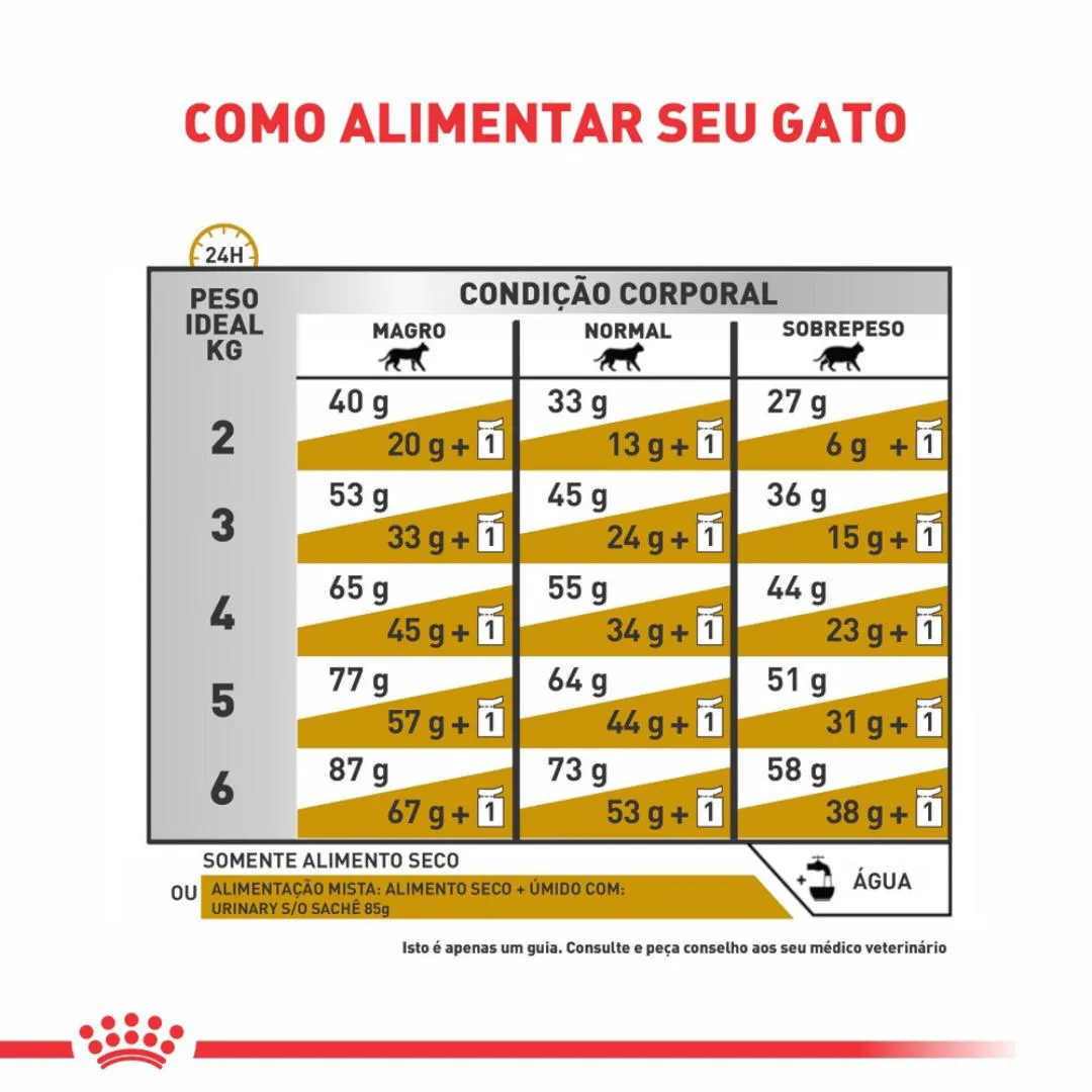 Problemas urinários em gatos, como a formação de cálculos de estruvita e oxalato de cálcio, causam dor intensa e podem ser recorrentes. A Royal Canin Urinary S/O é um alimento coadjuvante completo, formulado com precisão científica para auxiliar no manejo dessas condições e prevenir a reincidência, garantindo que seu gato viva com muito mais conforto.Através da metodologia RSS (Supersaturação Relativa), esta ração ajuda a criar um ambiente urinário desfavorável à formação de cristais, promovendo a saúde do trato urinário inferior.Destaques e Benefícios Principais: