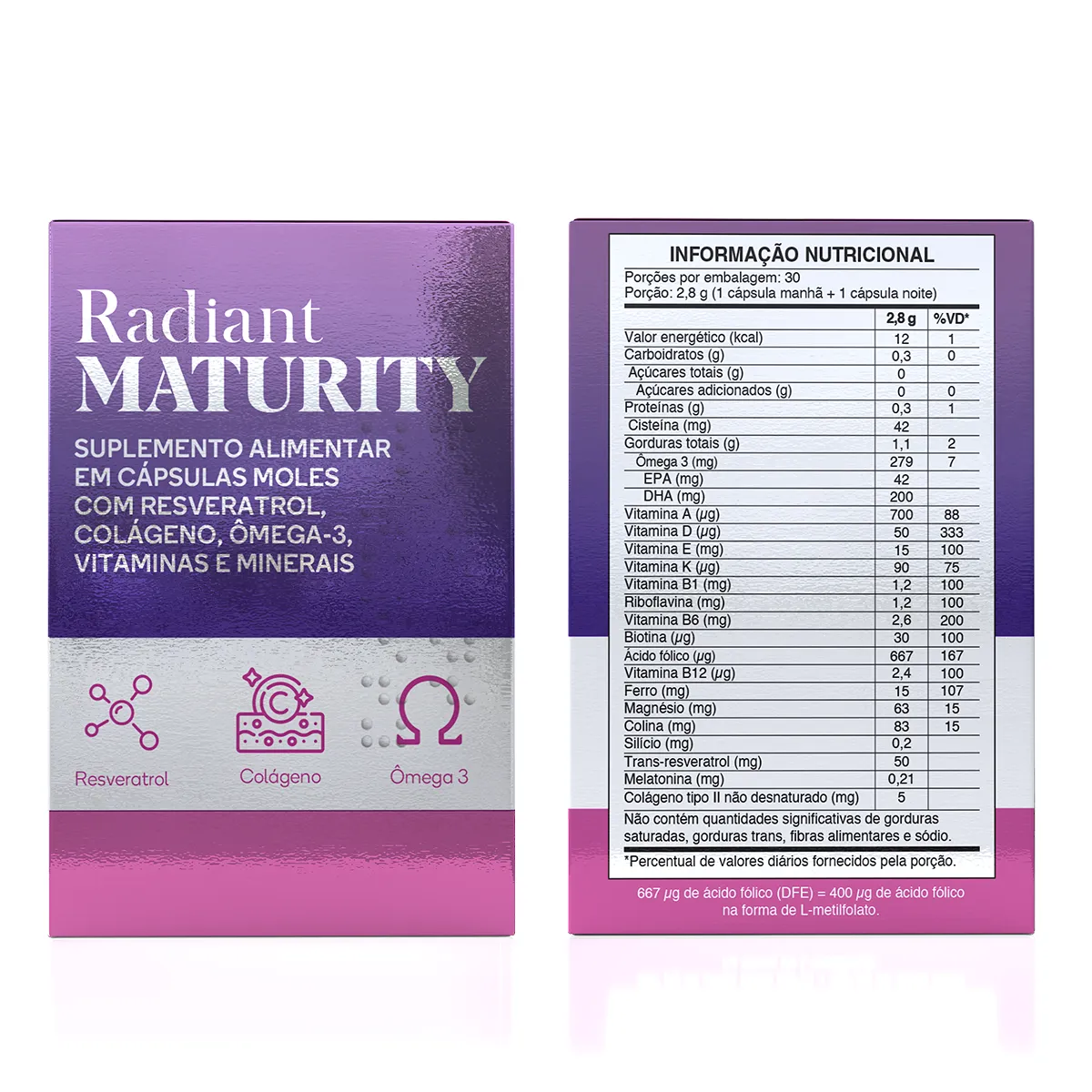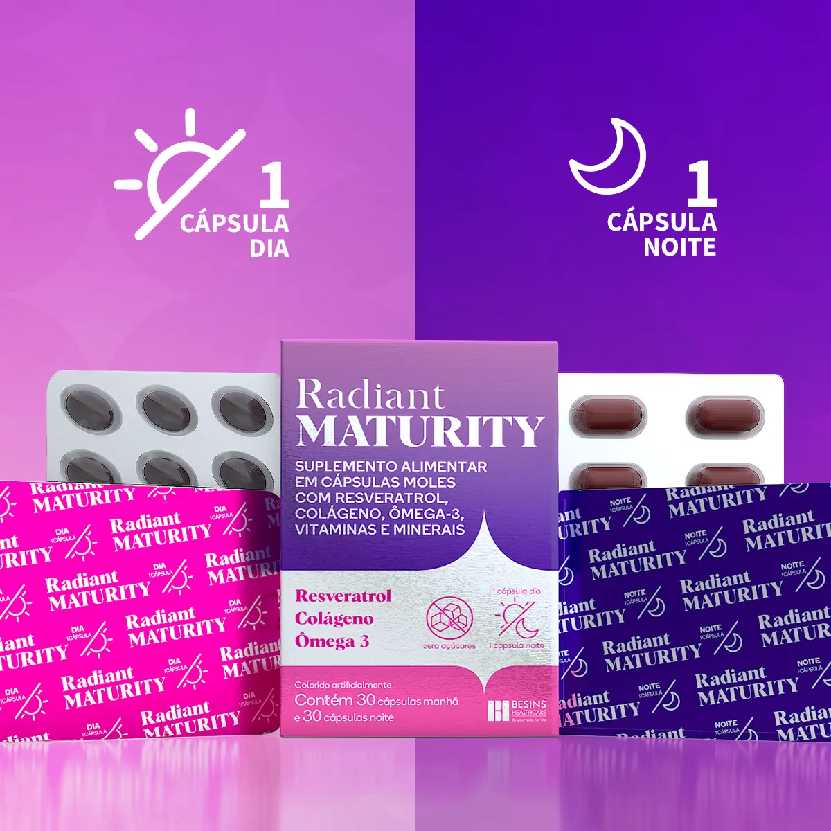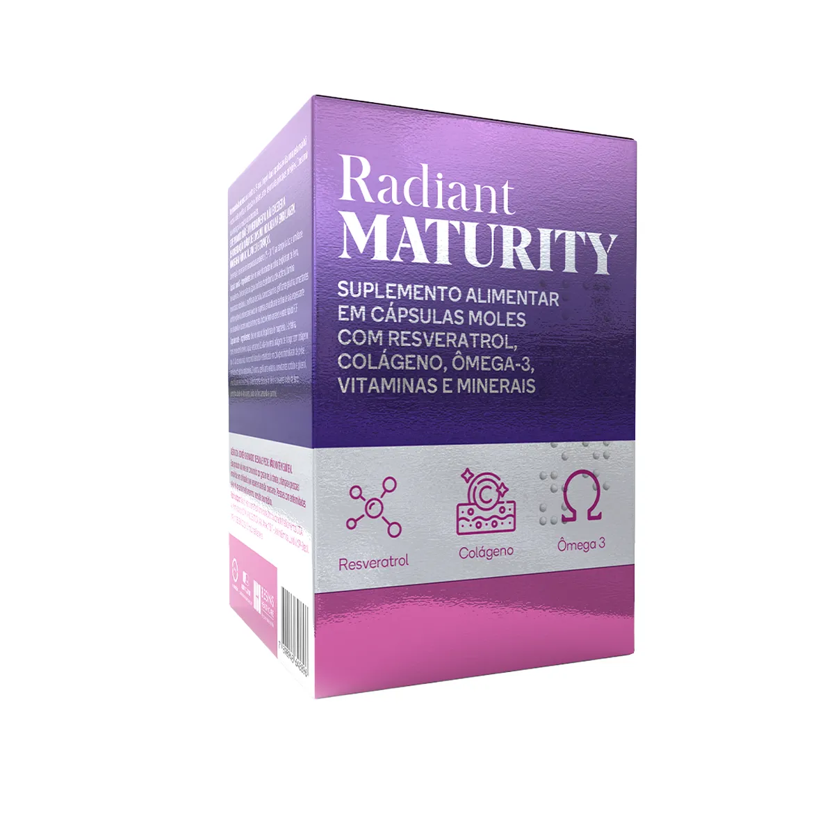 Radiant Maturity é um suplemento alimentar em cápsulas moles desenvolvido especialmente para mulheres a partir dos 40 anos. Sua fórmula completa reúne vitaminas, minerais e ativos essenciais para promover o bem-estar feminino, incluindo colágeno tipo II, ômega 3, biotina, melatonina, resveratrol e muito mais.